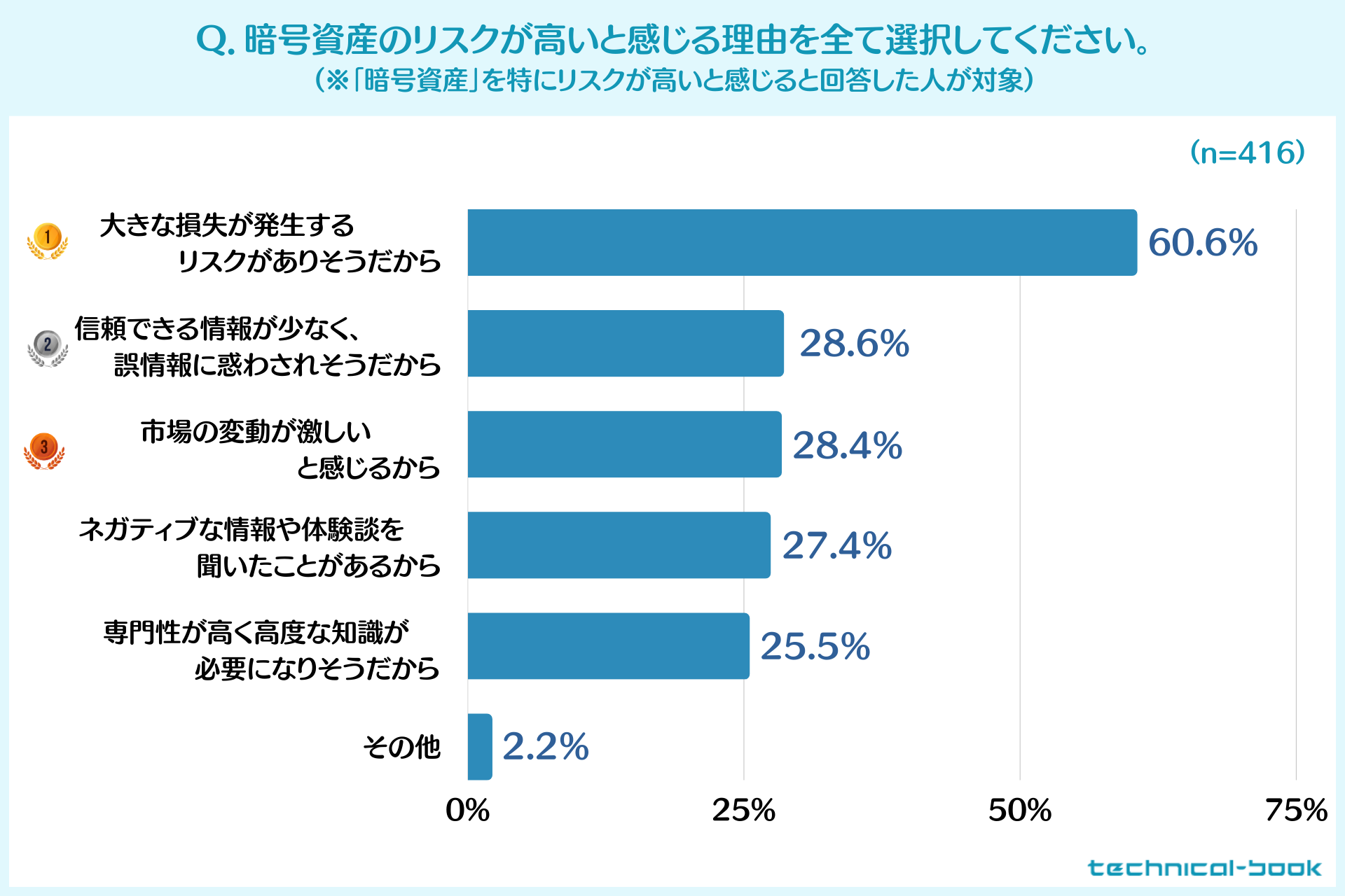 特にリスクが高い投資として「暗号資産」を回答した人を対象に理由を質問したところ、1位は「大きな損失が発生するリスクがありそうだから」の60.6%、2位は「信頼できる情報が少なく、誤情報に惑わされそうだから」の28.6%、3位は「市場の変動が激しいと感じるから」の28.4%となりました。