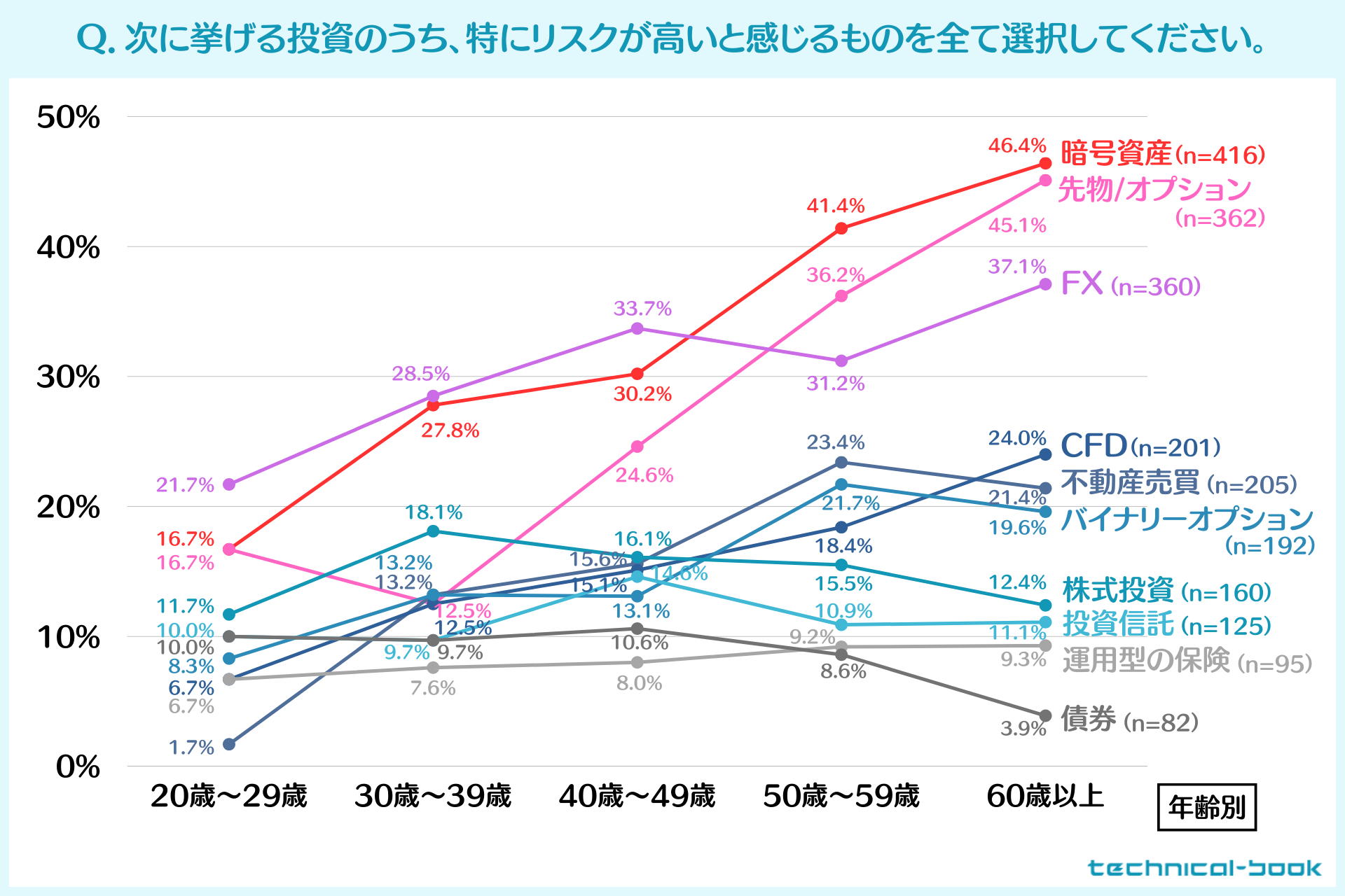 2.「暗号資産」と「先物/オプション」は、年代が上がるほどリスクが高いと感じる人が増える傾向が顕著