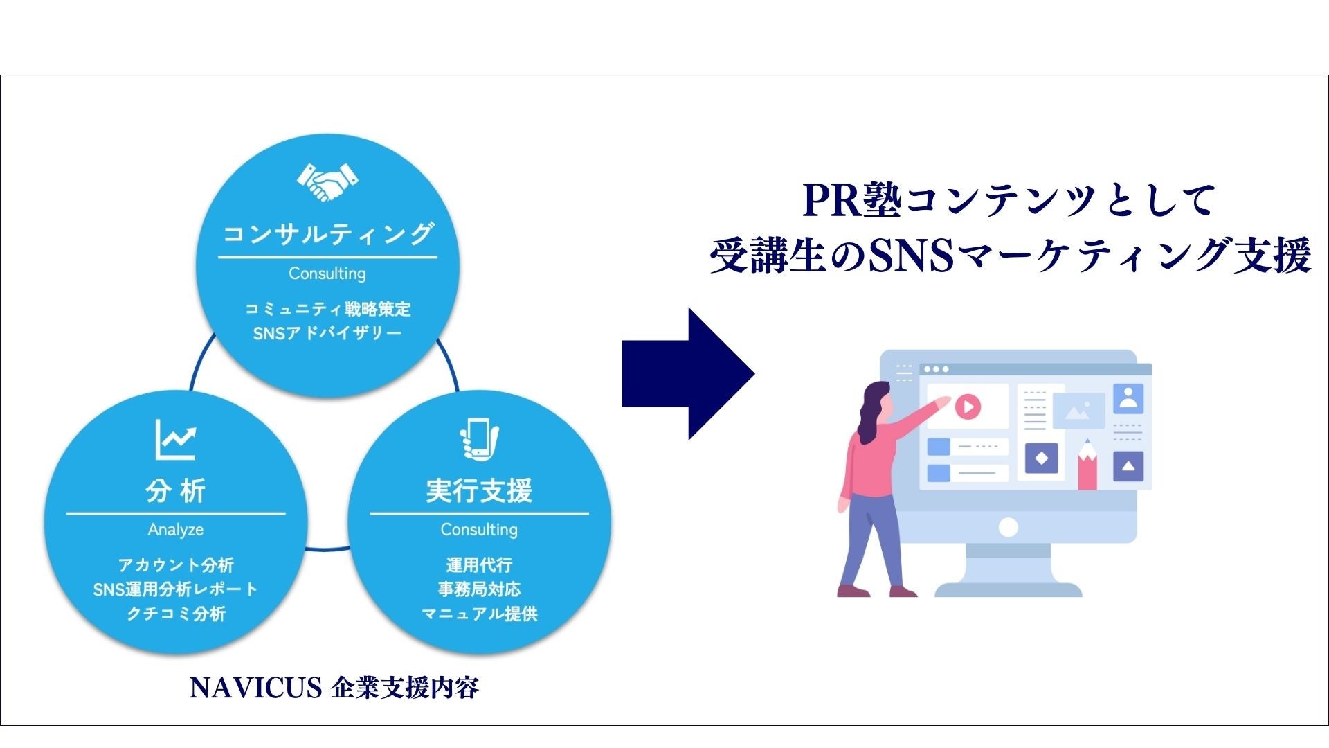 弊社の主宰するPR塾では、メディアPRだけでなく、SNSや出版、WEBマーケティングなどを幅広くお伝えしております。しかし、これからのAI時代、さらにSNSが普及しユーザー数が増えていくこの時代の変化に合わせ、より最新で再現性の高い、PDCAをして磨かれたSNSのノウハウを提供したいと思い、この度SNSに関して300社以上の企業の継続支援をしている、株式会社NAVICUSと業務提携することとなりました。