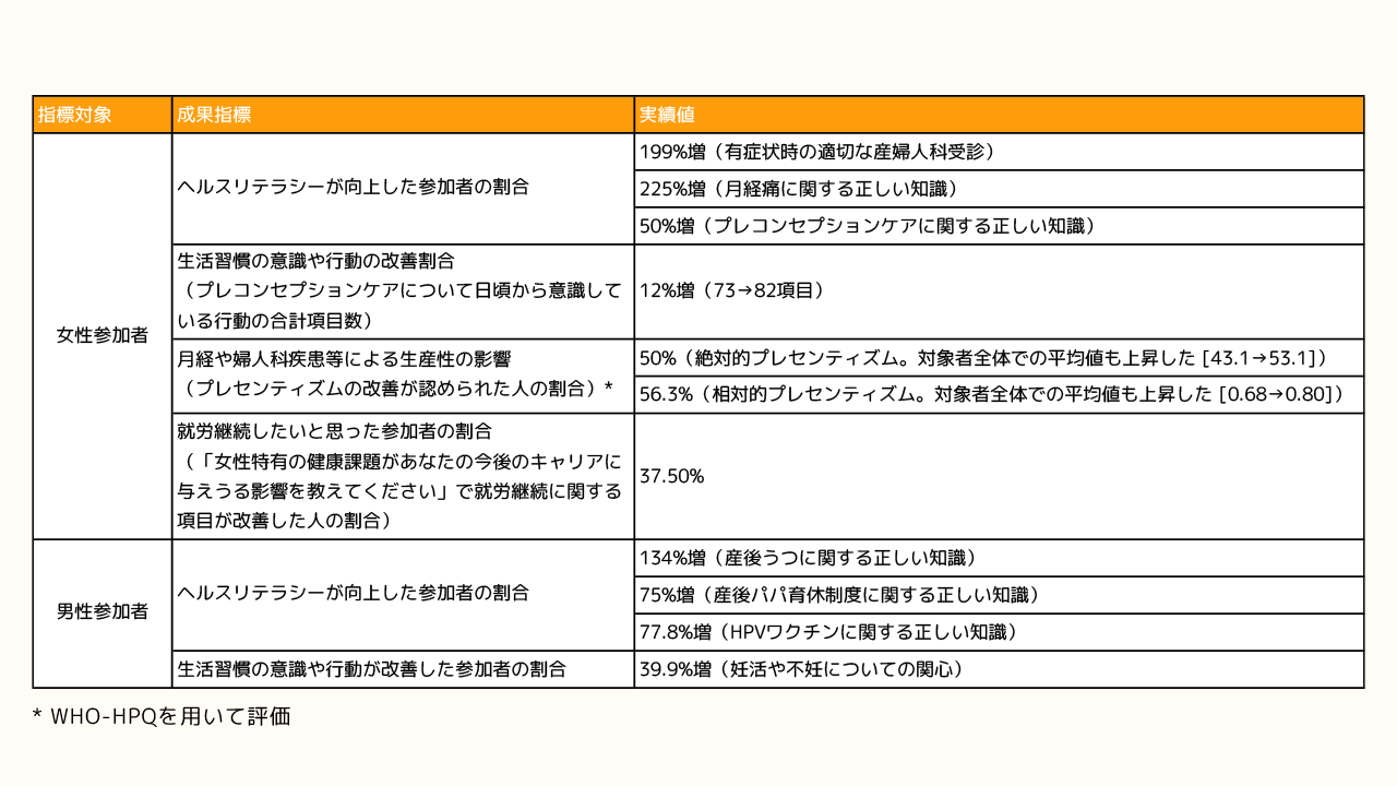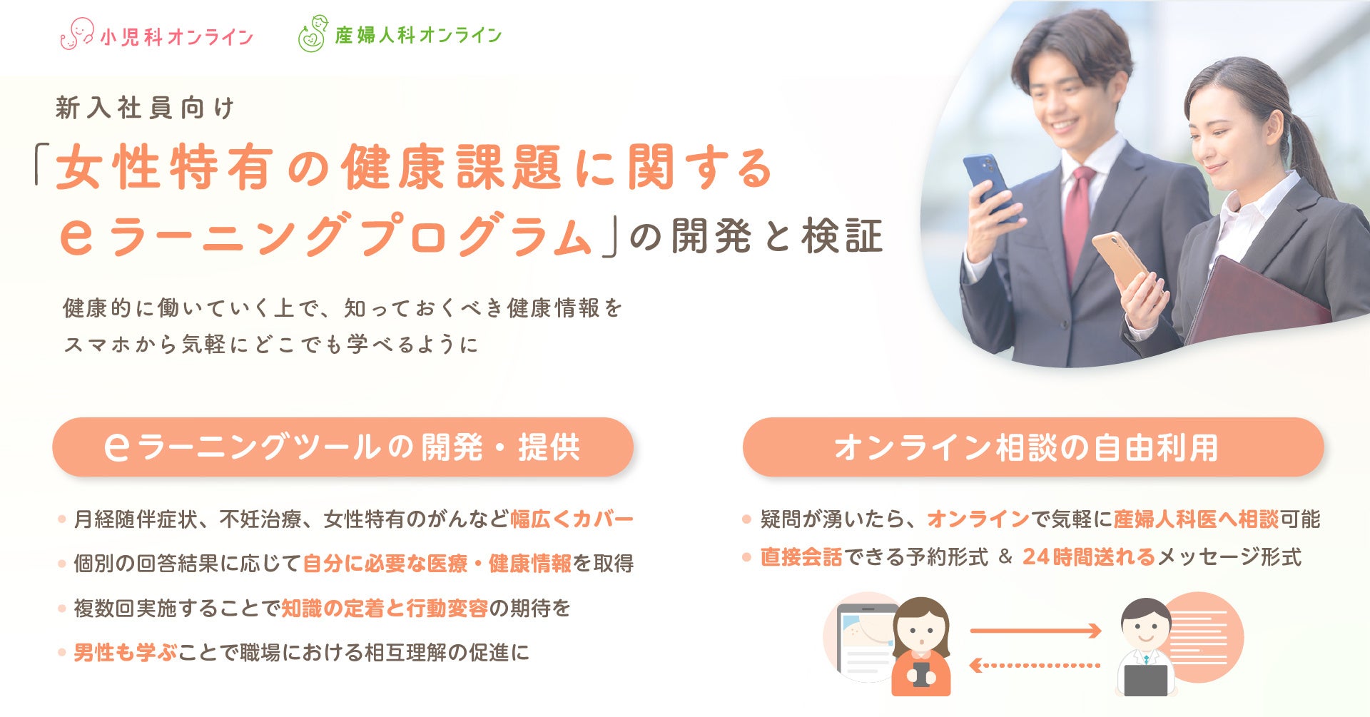 本プロジェクトでは、産婦人科医が中心となって新規に開発したeラーニングツールを用いた若手社員向けプログラムを提供し、女性特有の健康課題に関する知識や行動への効果や、生産性への影響を検証しております。
