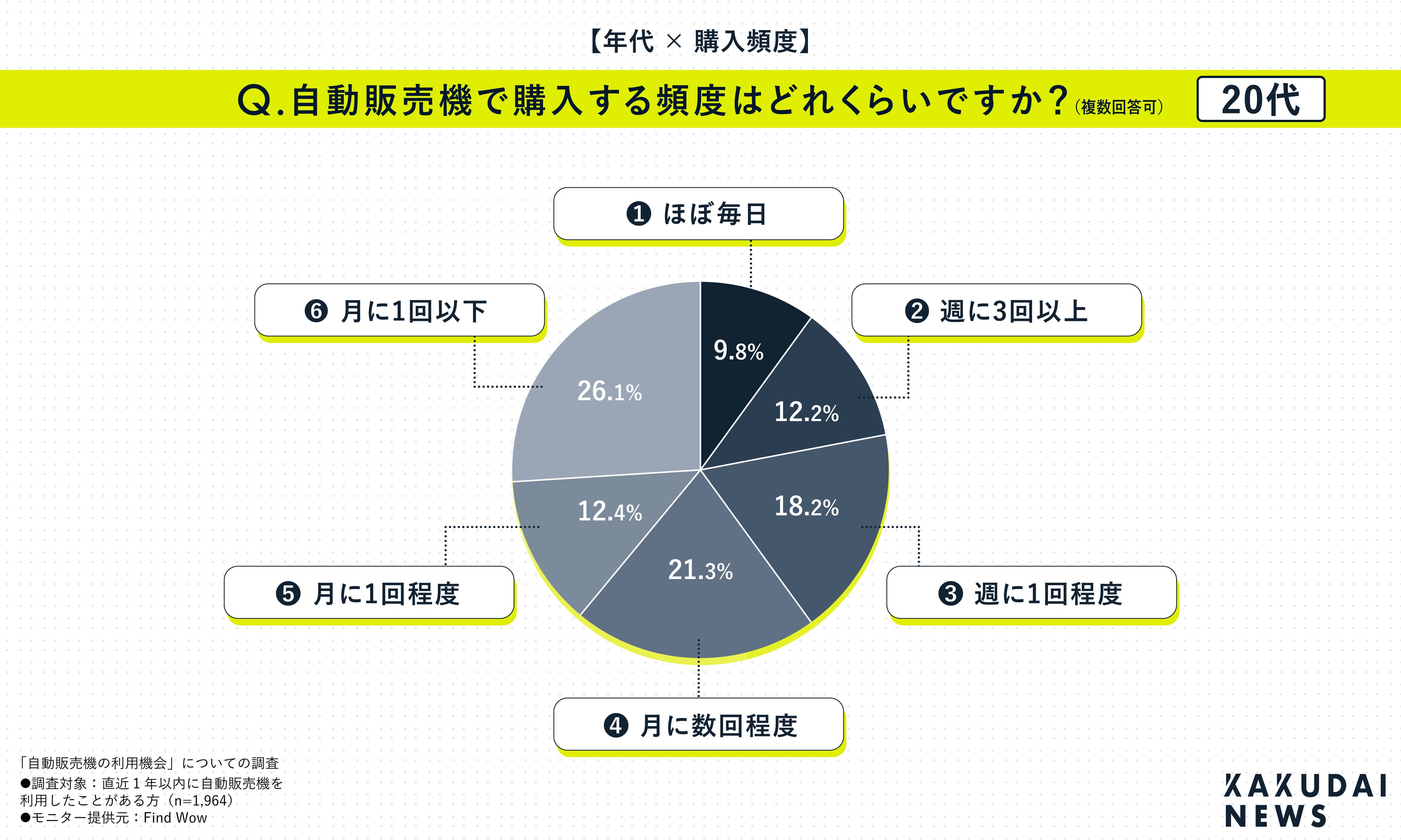 今回の調査により、自動販売機の利用頻度は20代、30代が多く、年代が高くなるにつれて、利用頻度が低くなることが分かりました。
