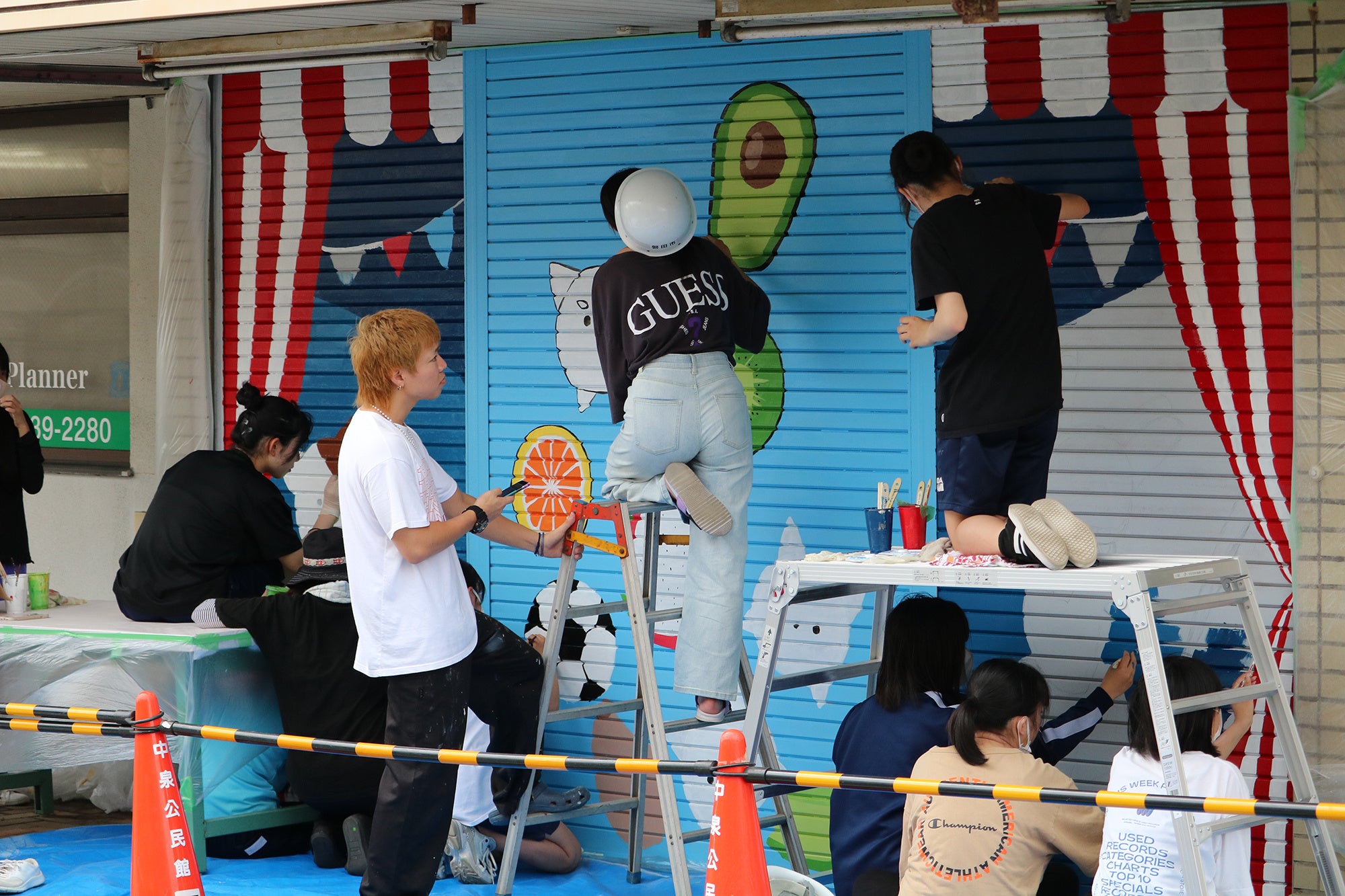 シャッターアートの製作にあたっては、中泉地区が下準備を行い、これまでシャッターアートを手掛けたことのある市内在住のアーティストの鈴木海斗さんのサポートをいただきながら、高校生たちが土曜・日曜の2日間で仕上げてくれました。