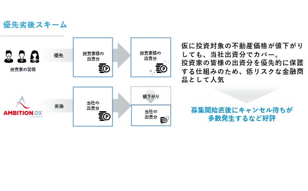 仮に投資対象の不動産価格が値下がりしても、一定の額までは当社劣後出資分でカバーし、投資家の皆様の出資分を優先的に保護する仕組みのため、キャンセル待ちが出るなどご好評いただいております。2021年6月に組成したA funding 5号案件では、募集開始後10分で募集金額を達成しました。