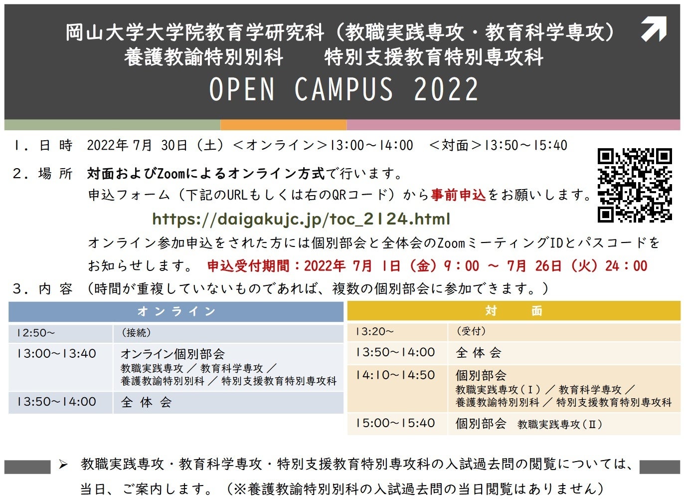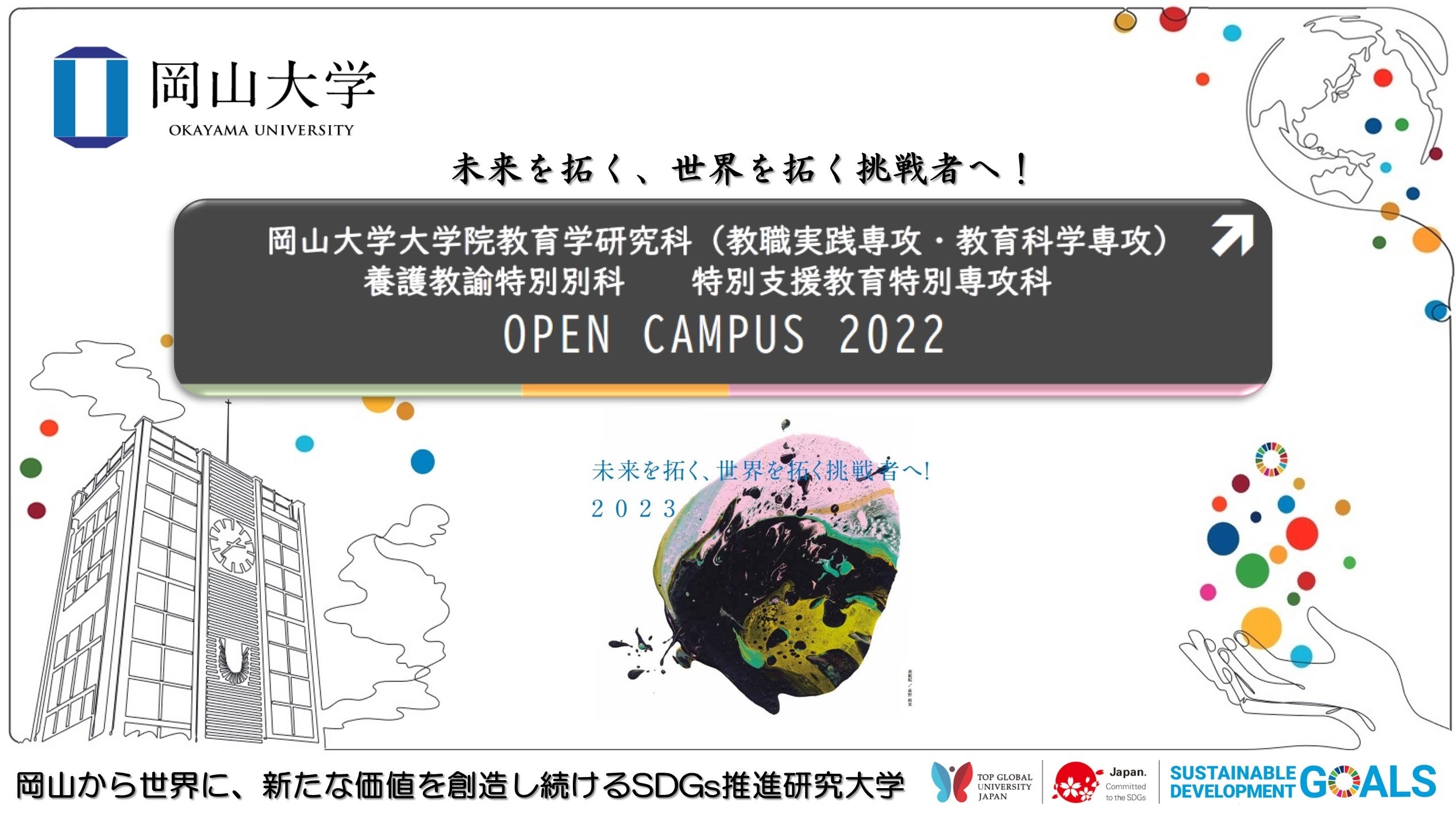 国立大学法人岡山大学(本部:岡山市北区、学長:槇野博史)の大学院教育学研究科では、研究科(教職実践専攻・教育科学専攻)、養護教諭特別別科、特別支援教育特別専攻科のオープンキャンパスを、2022年7月30日(土)にZoomによるオンライン方式と対面方式の両方で開催いたします。