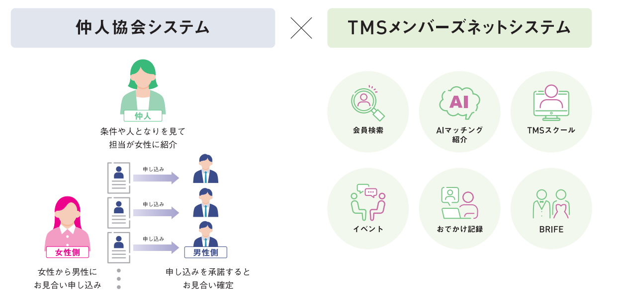 希望条件や人柄などを考慮して、仲人がおすすめのお相手をご紹介し、手組みでお見合いを組む「仲人協会システム」と、約75,000名以上の中から、希望条件を元に会員検索でお見合いを申し込める「TMSメンバーズネットシステム」と、2つのシステムからお相手探しを行います。