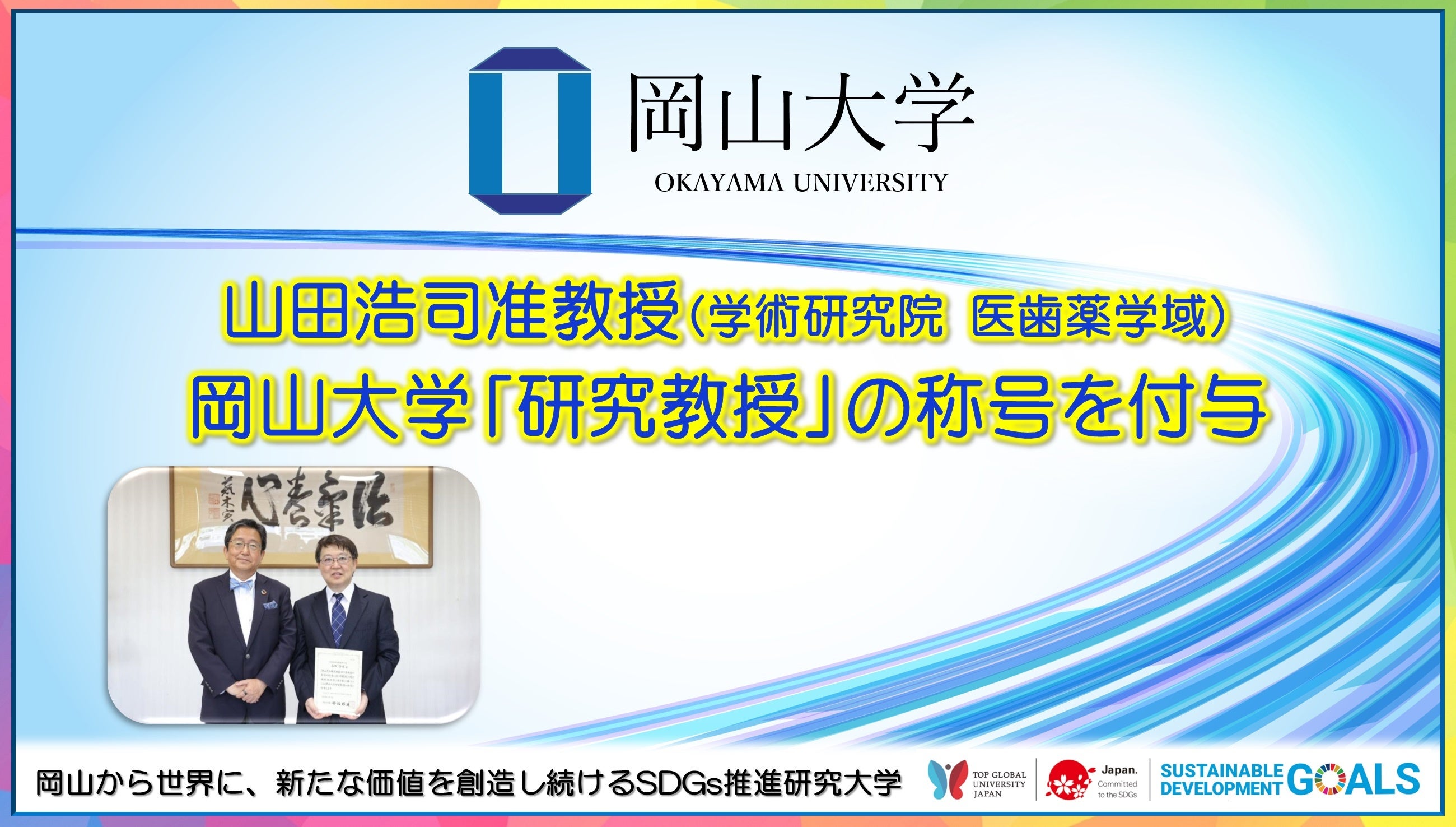 国立大学法人岡山大学(本部:岡山市北区、学長:那須保友)は、学術研究院医歯薬学域の山田浩司准教授を研究教授として選任し、2023年7月6日に研究教授の称号付与式を本学津島キャンパスの学長室において開催しました。付与式では、那須保友学長から研究教授の認定証が手渡されました。