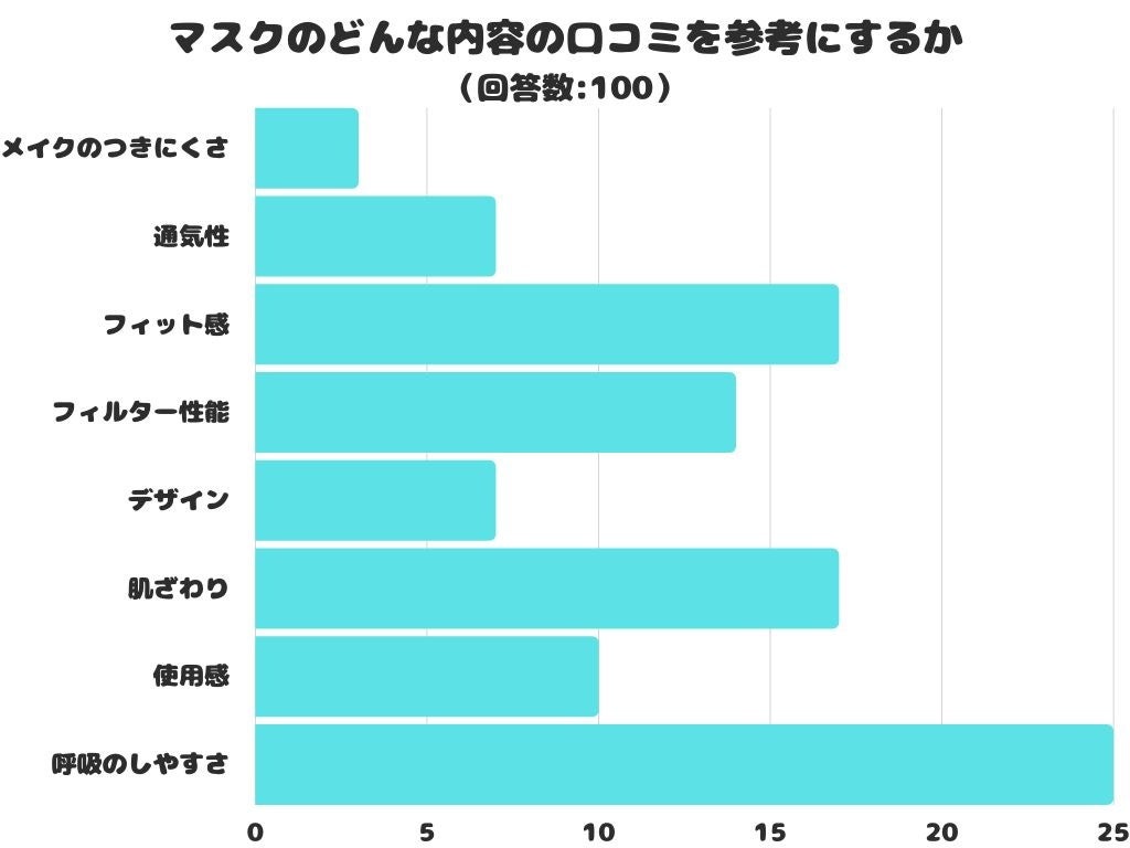 マスクのどんな内容の口コミを参考にするかをアンケートにて調査したところ、1位は「呼吸のしやすさ」でした。