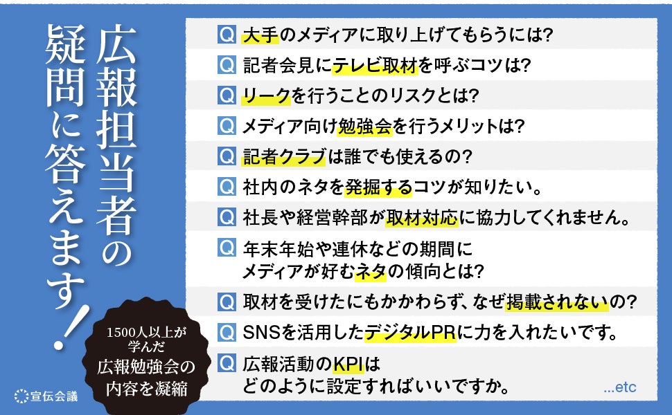大手から中小企業、ベンチャー企業まで、1500人以上が学んだ人気の広報勉強会の内容を凝縮した、実践的な広報の教科書。メディアの関心を引く話題のつくり方からプレスリリースの書き方、メディア露出効果を最大化させるオウンドメディア・SNS活用法、ChatGPT活用まで、詳細にわたって解説します。広報担当者の素朴な疑問やちょっとした悩みに答える、30問のQ&Aを巻末に掲載しています。