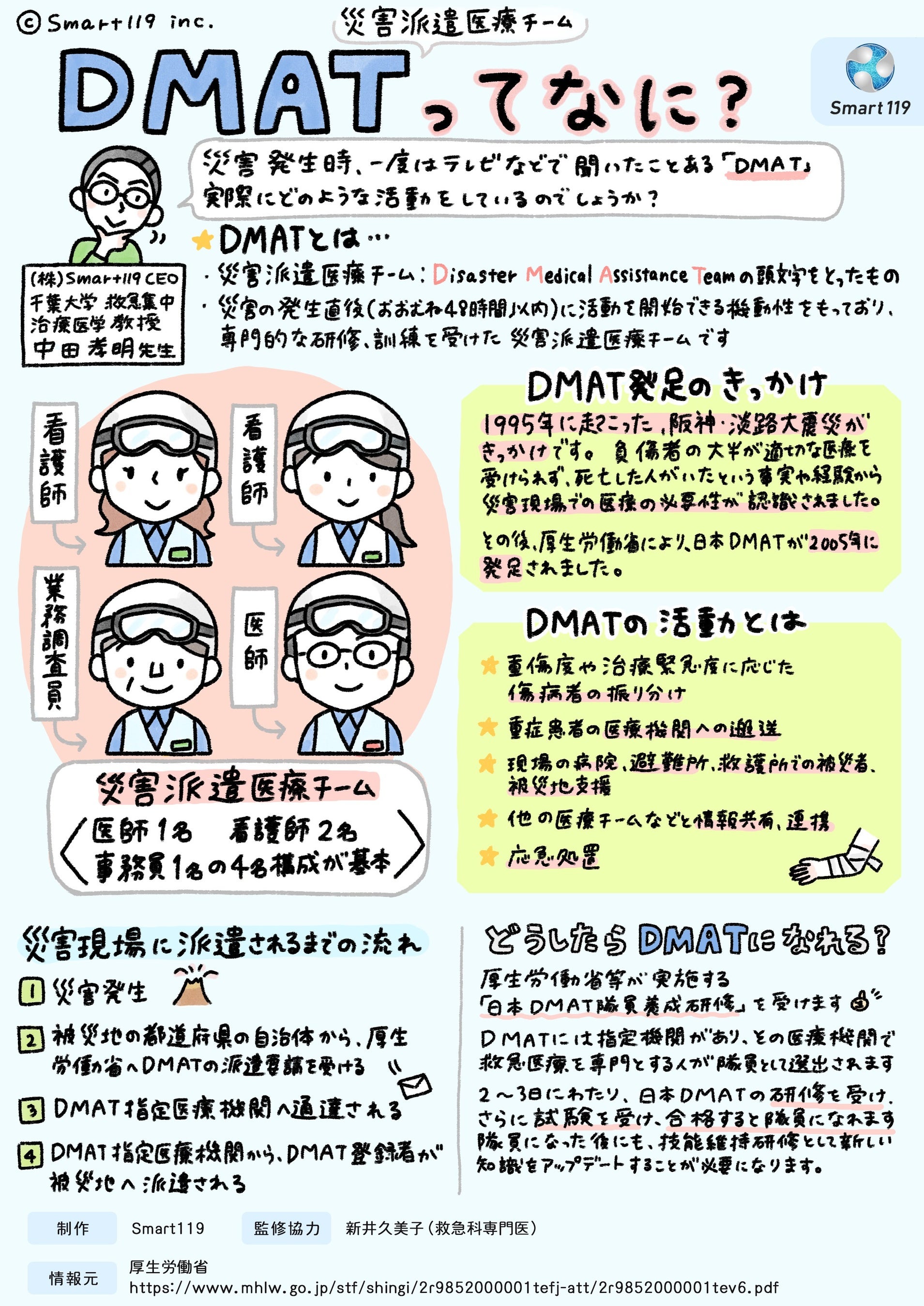 災害派遣医療チーム:Disaster Medical Assistance Teamの頭文字をとったもの