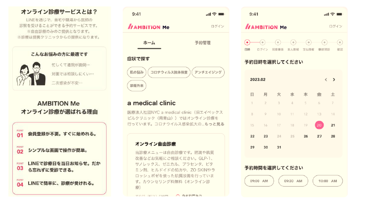 一般的な自費診療医療サービスを提供しているクリニックへシームレスに連携し「AMBITION Me」内で簡単に予約することができ、その後LINEを活用し簡単にオンライン診療を受診する事が可能となります。その上で専門的な知識を持つ医師が入居者の症状を詳細にヒアリングし、必要なアドバイスや治療法を提案します。さらに、迅速で便利な医療サービスを実現し、入居者の皆様の健康を支えます。