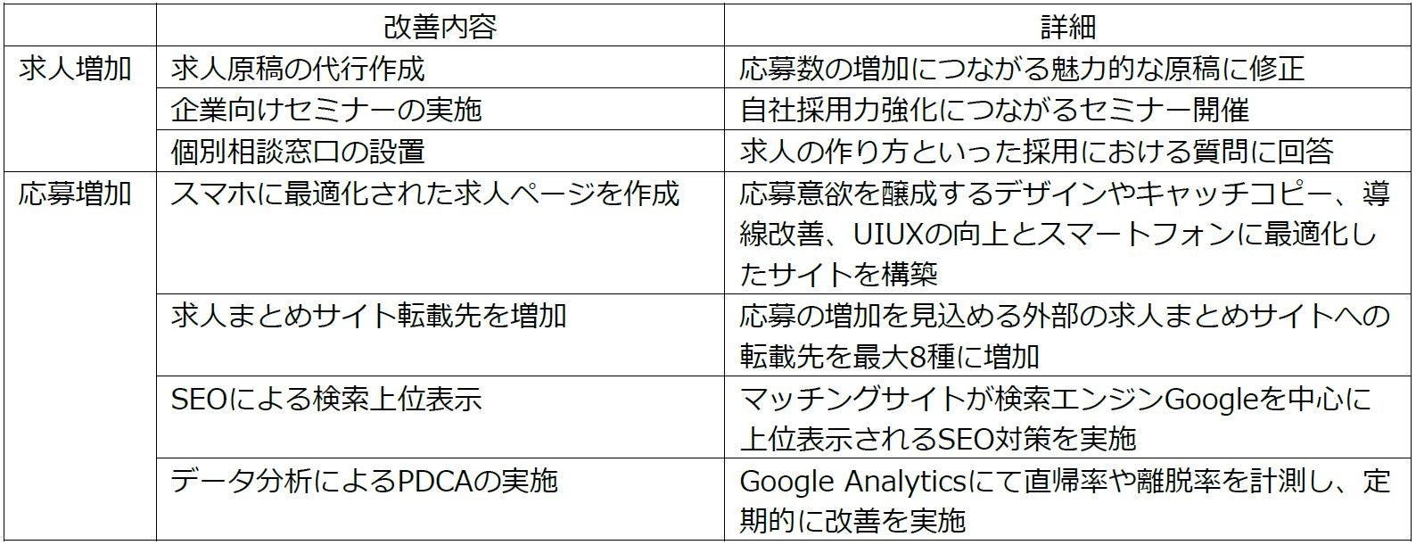 従来のマッチングサイトに対する以下の改善により、求人数・応募数・就業数の増加を実現します。