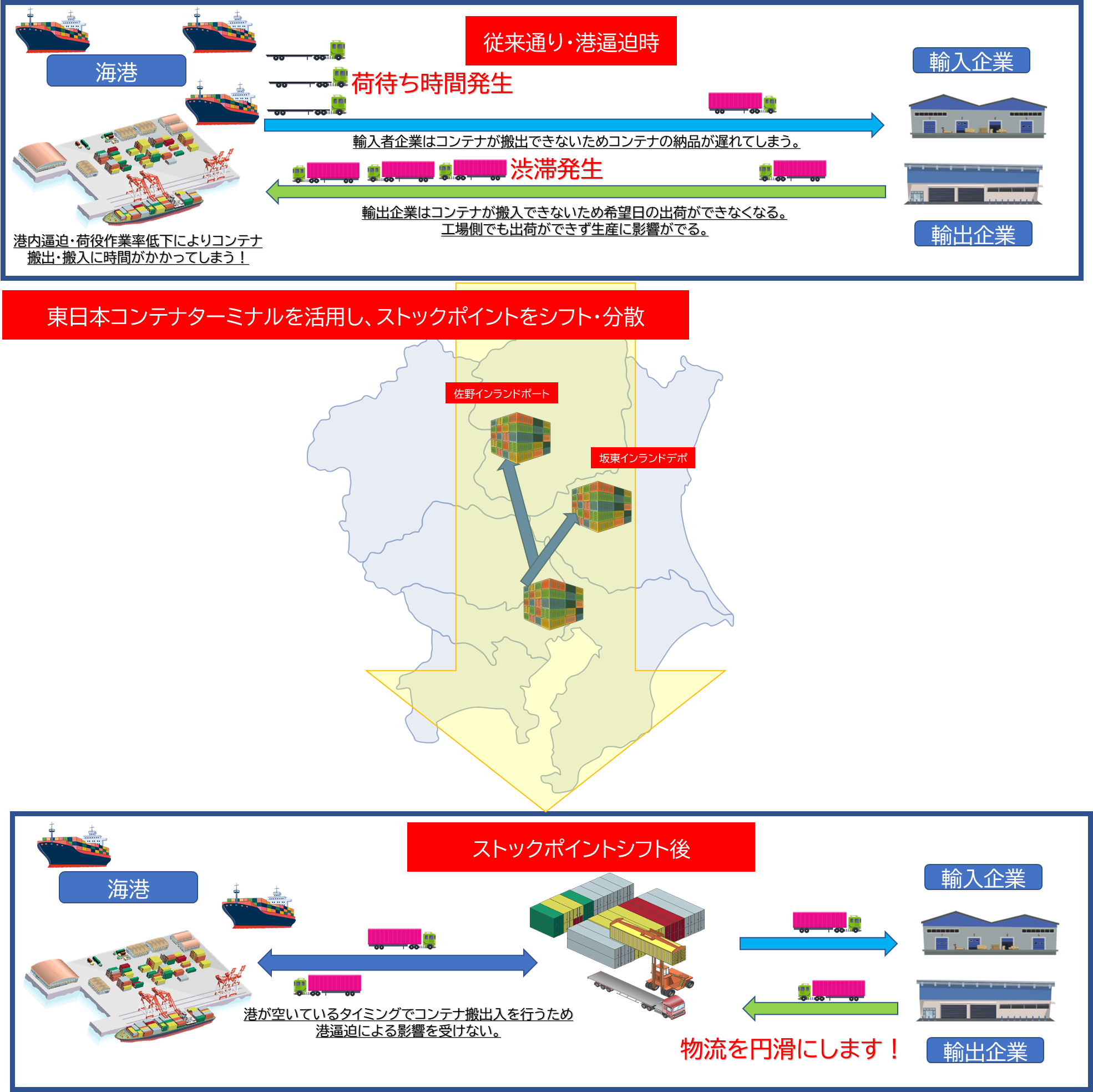 船から降ろしたコンテナを、コンテナヤードに保管しておきたいというニーズは非常に高く、港湾地区のコンテナヤード不足への対応として「コンテナお預かりサービス」を提供してまいりました。今回のインランドデポ高機能化に伴って、「コンテナお預かりサービス」の容量も順次拡張してまいります。陸揚げされたコンテナのストックポイントを内陸のコンテナヤードへのシフトをさらに推進することで、渋滞や混雑の影響を最小化することが可能となります。