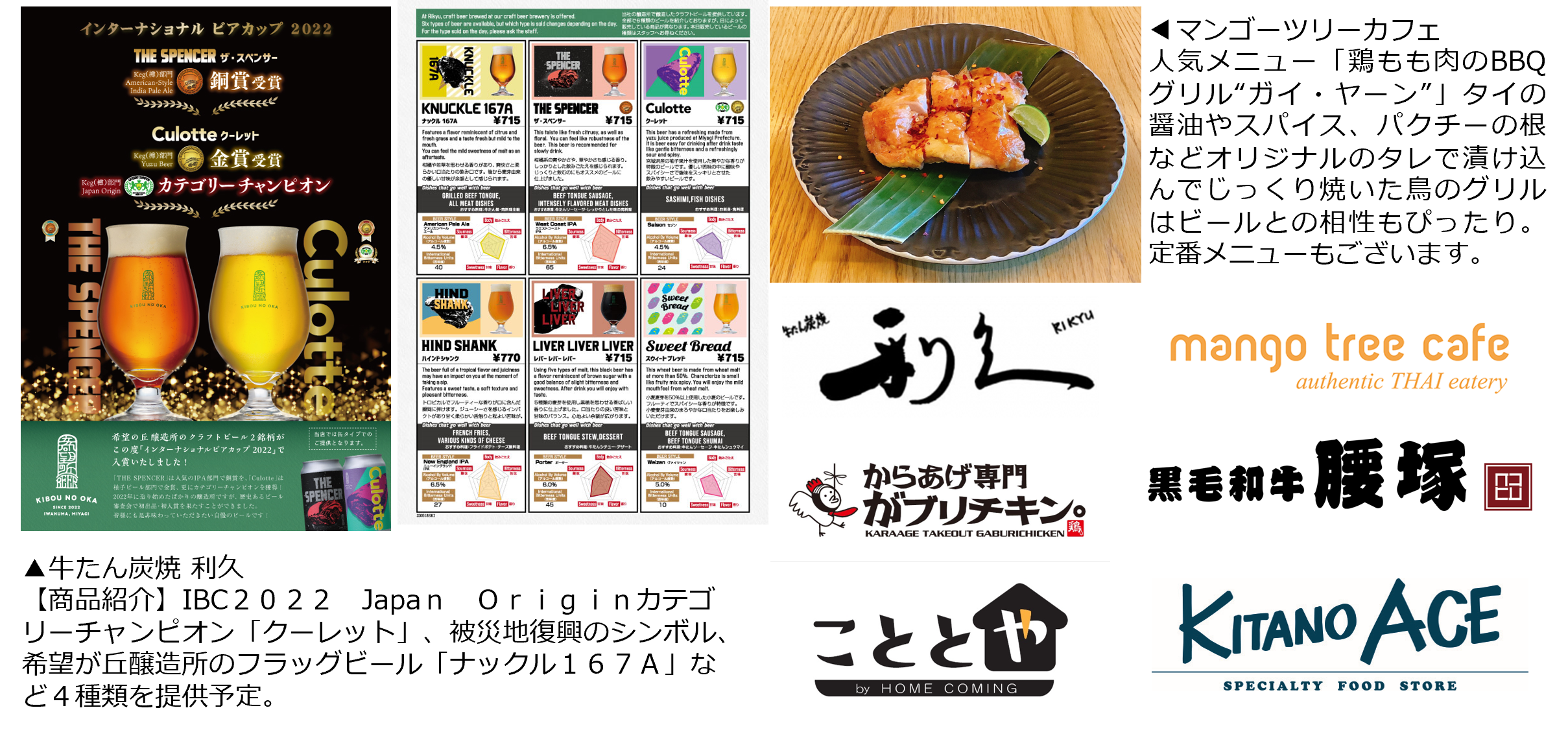 「KITANO ACE」「こととや」「牛たん炭焼 利久」からはビールやおつまみ、「からあげ専門 がブリチキン」や「黒毛和牛 腰塚」「マンゴツリーカフェ」からはお惣菜など、ビールにぴったりなラインナップがルーファ広場にサテライト出店いたしします。