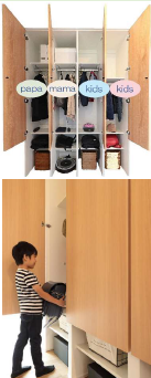 ハンガーパイプと上部棚は子どもの成長に合わせて高さの調整ができ、また、職場