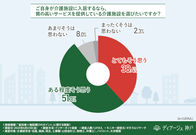 そこで、「ご自身が介護施設に入居するなら、質の高いサービスを提供している介護施設を選びたいですか?」と質問したところ、『とてもそう思う(38.4%)』『ある程度そう思う(51.3%)』『あまりそうは思わない(8.0%)』『まったくそうは思わない(2.3%)』という回答結果になりました。