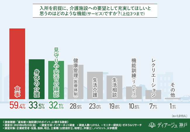 「入所を前提に、介護施設への要望として充実してほしいと思うのはどのような機能(サービス)ですか?(上位3つまで)」と質問したところ、『食事(59.4%)』と回答した方が最も多く、次いで『身体の介護(33.5%)』『見守りや安否の確認(32.1%)』『健康管理(医療体制)(28.9%)』『生活介護(23.0%)』『生活相談(19.8%)』『機能訓練(リハビリ)(10.6%)』『レクリエーション(7.7%)』と続きました。