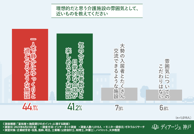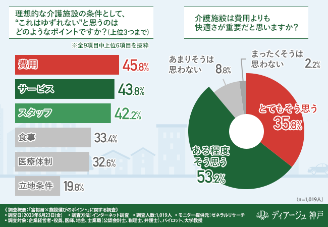 そこで今回、介護付き有料老人ホーム『ディアージュ神戸』(https://www.diage-kobe.com/)を運営するJR西日本プロパティーズ株式会社は、企業経営者・役員、医師、地主、士業職(公認会計士、税理士、弁護士、税理士)、パイロット、大学教授を対象に、「富裕層×施設選びのポイント」に関する調査を実施しました。