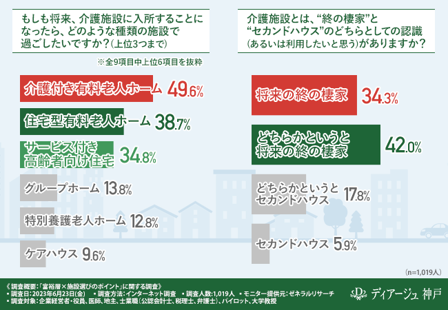 また、介護施設と聞いて思い浮かぶのは、自宅のほかに定期的に居住できる住まい「セカンドハウス」よりも、老後の人生の“終の棲家”といったイメージのほうが強いことがわかりました。