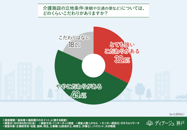 続いて、「介護施設の立地条件(景観や交通の便など)については、どのくらいこだわりがありますか?」と質問したところ、『とても強いこだわりがある(32.6%)』『ややこだわりがある(49.4%)』『こだわりはない(18.0%)』という回答結果になりました。