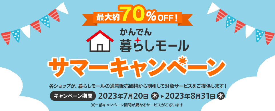 暮らしのお役立ちサービスに特化した、「はぴeみる電」会員向けのECモール「かんでん暮らしモール」において、より多くの「はぴeみる電」会員の皆さまがおトクにサービスをご利用いただけるよう、期間限定のキャンペーンを実施いたします。本キャンペーンでは、最大約70%OFFのサービスもあり、大変おトクな価格でご利用いただけます。ぜひこの機会に、かんでん暮らしモールのサービスをご利用ください。