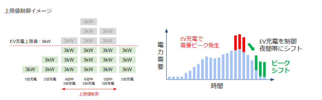 物流業界を中心に業務用車両のEVへの転換が加速していますが、企業が1つの拠点に複数台のEVを配備する場合、充電タイミングが重なることによりピーク電力が増大し、事業者の電気料金の負担増加を招くことが課題となっています。また、夕方の電力需要が高まるタイミングでEVの充電が行われることにより、電力の安定供給に影響を及ぼす可能性も指摘されています。