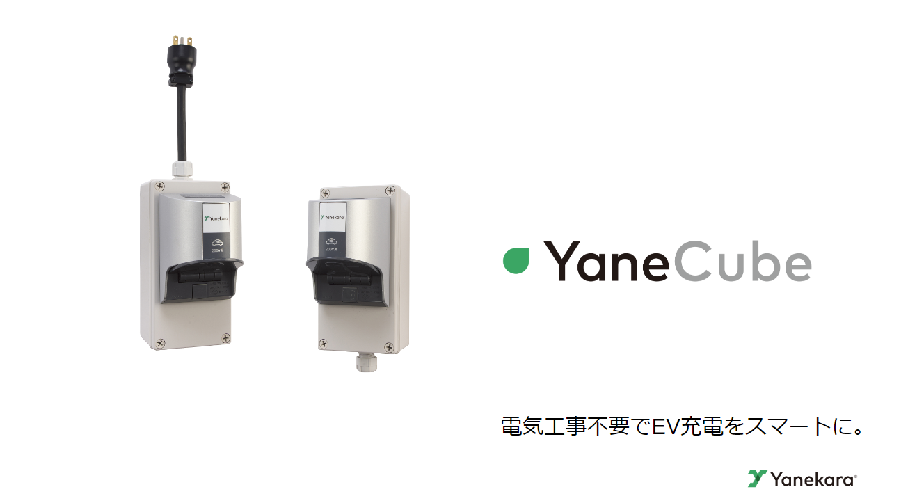 YaneCubeは、EVの普通充電コンセントをクラウドから制御する充電コントローラーとして、既設のコンセントに電気工事不要で設置できる、国内唯一の製品です(Yanekara調べ)。