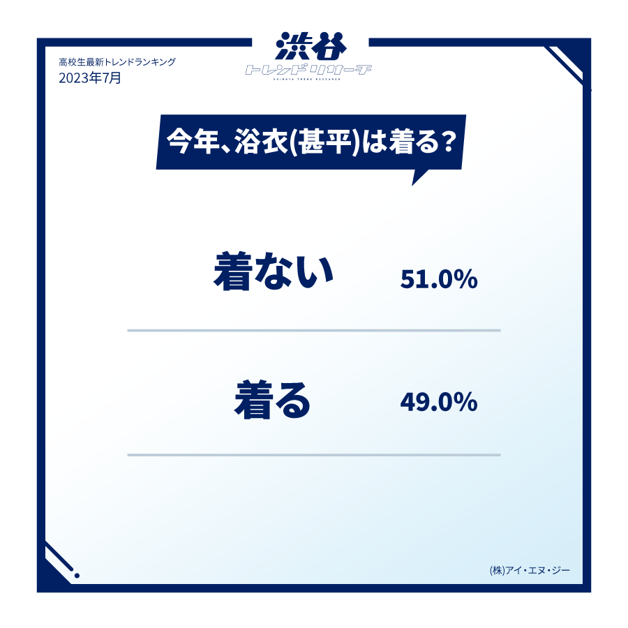 「着ない」を選択する高校生が僅差で多い結果となりました。理由として「着たいけど、浴衣(甚平)を持っていない」という声が多数寄せられ、レンタルサービスを利用する人は少数のようでした。また、「人混みが苦手だから夏祭りに行かない」というコメントも散見されました。