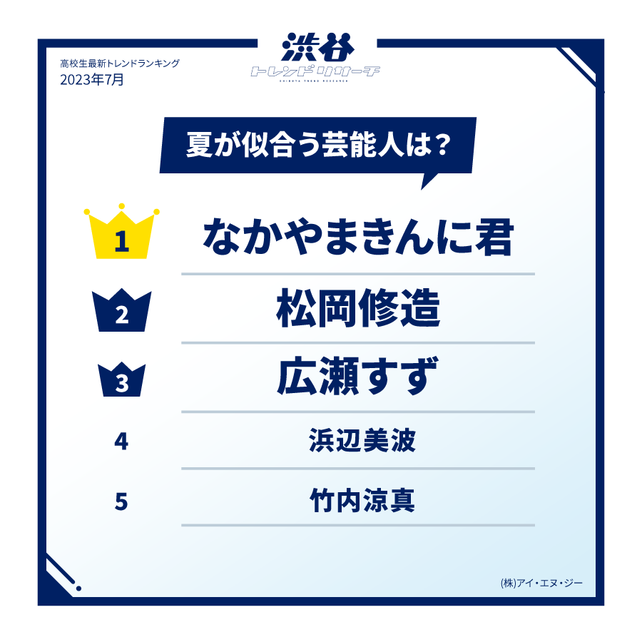 「なかやまきんに君」さんが1位を獲得。「太陽と海が似合う」といった声が集まったほか、「健康的」「とにかく熱い」などがあり、2位にランクインした「松岡修造」さんにも同様のコメントが寄せられました。3位は、「広瀬すず」さん。連続テレビ小説『なつぞら』への出演や、制汗剤や炭酸飲料、アイスなどTVCMでの爽やかなイメージから選出されているようでした。