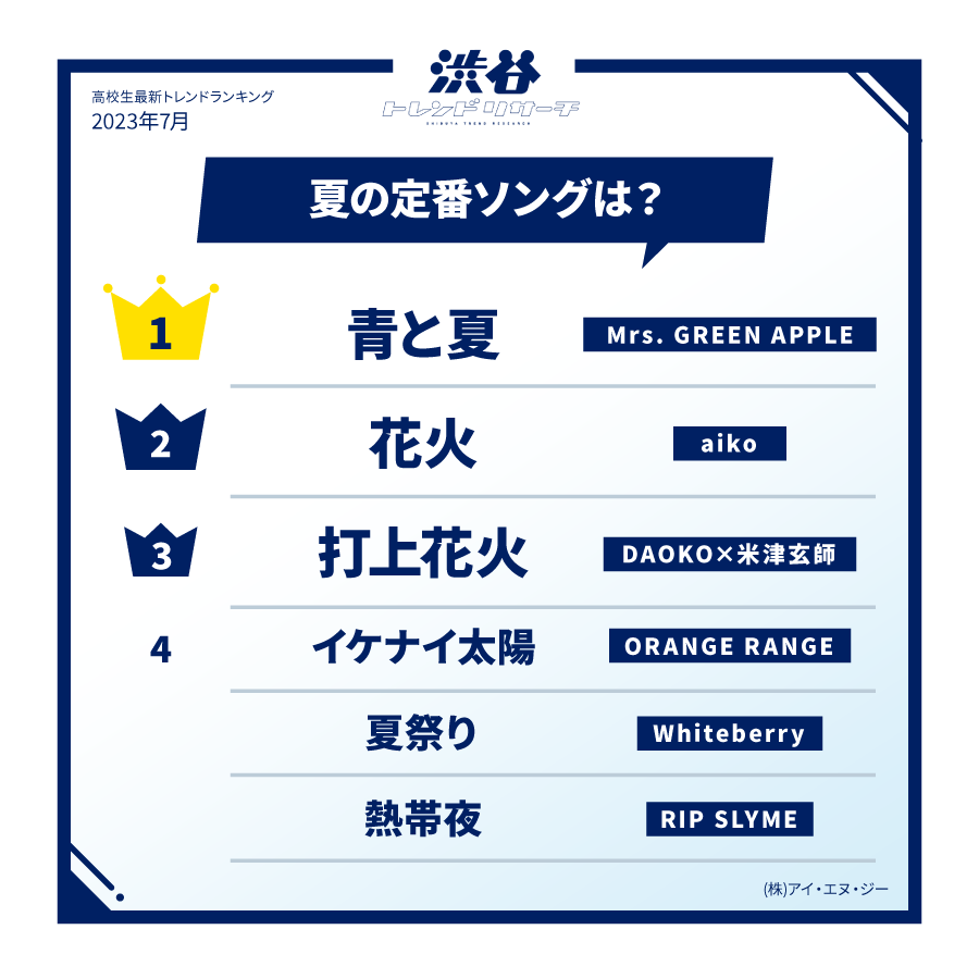 昨年度に続き「青と夏/Mrs. GREEN APPLE」が1位を獲得。体育祭や合唱祭などの学校行事で使用される機会が多く、”夏の青春ソング”として高い支持を得ています。2位は「花火/aiko」、3位には「打ち上げ花火/DAOKO×米津玄師」がランクイン。「花火/aiko」は1999年のリリースですが、カラオケの定番ソングとして現代の高校生に定着しており、世代を超えて愛され続けています。