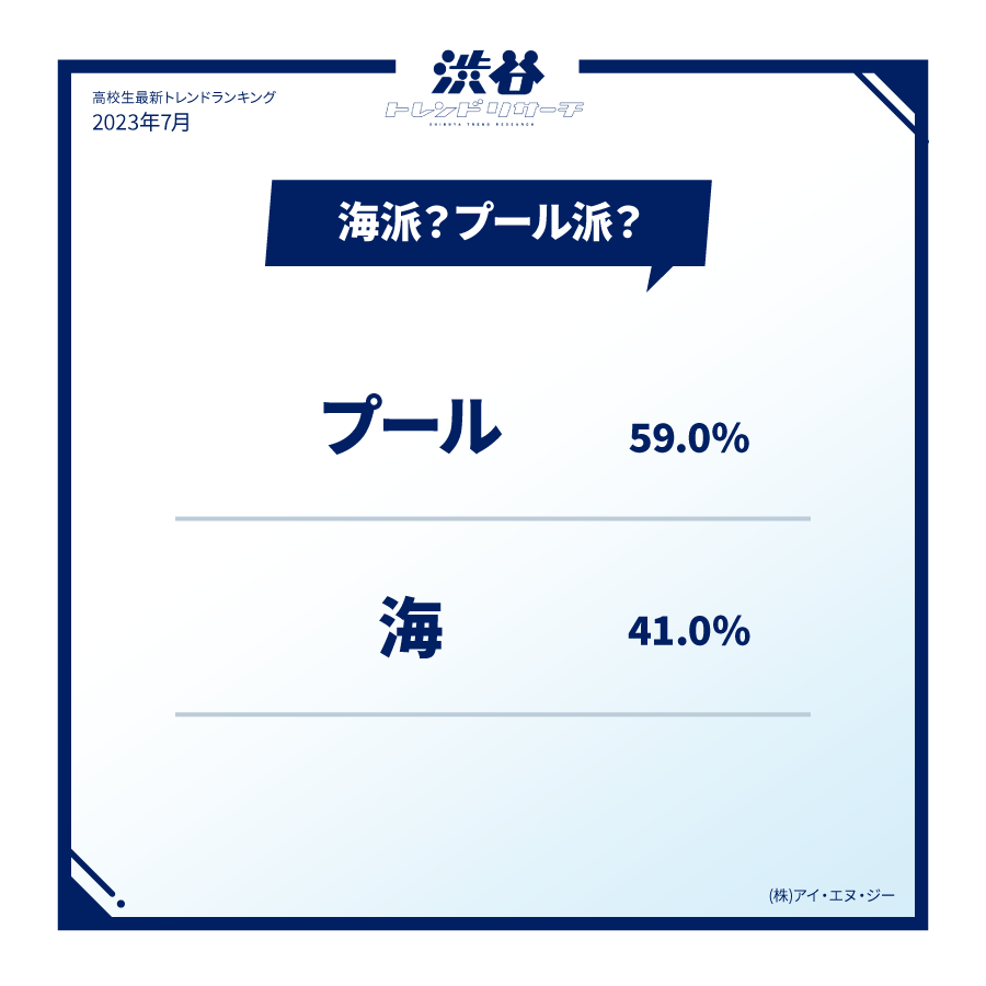 「プール」派が半数を超える結果となりました。「設備が充実しているから」のほか、「日焼けをしなくてすむし、海水でベタベタしたくない」「クラゲがいたりすると危険だから」といったコメントが見られ、海に対してマイナスなイメージを持つ高校生も少なくないようです。
