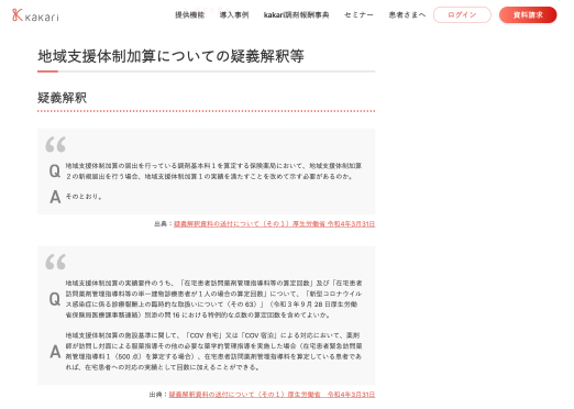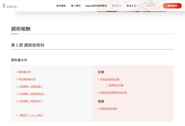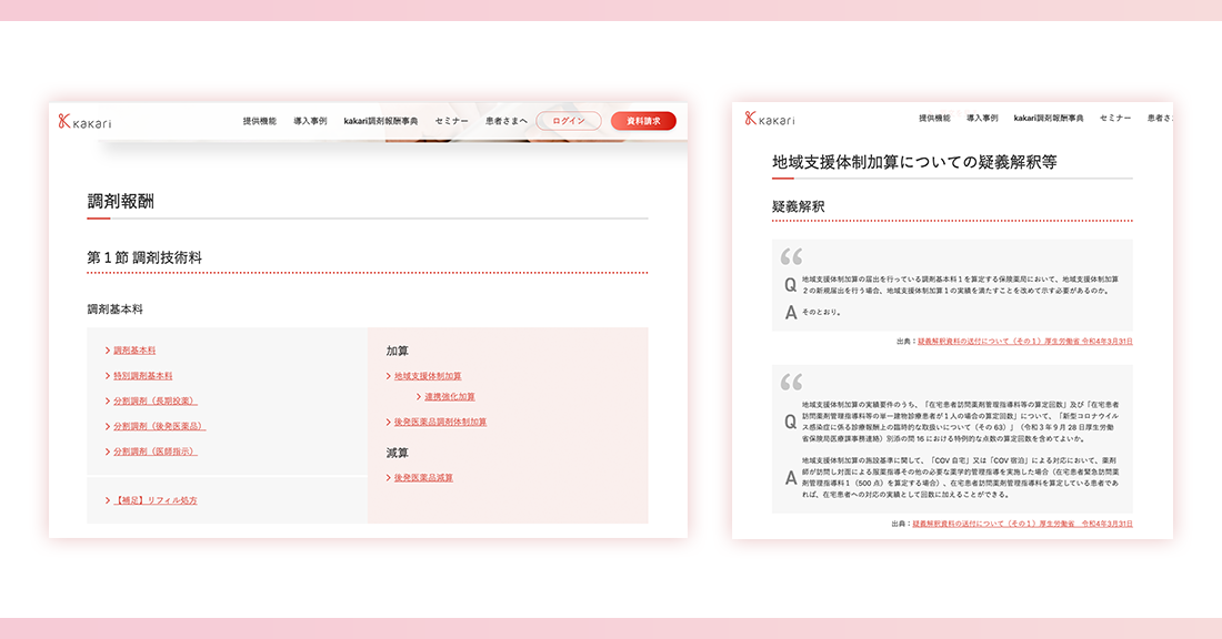 そこで、「kakari」では、薬局における調剤報酬に関わる業務負担を軽減することを目的に、『kakari調剤報酬事典』を公開いたしました。薬剤師監修のもと、各項目についてサマリを掲載する他、加算要件もわかりやすく表示、ページ下部に疑義解釈や事務連絡などの最新情報をタイムリーに一覧化することで、情報へのアクセスを容易にしました。