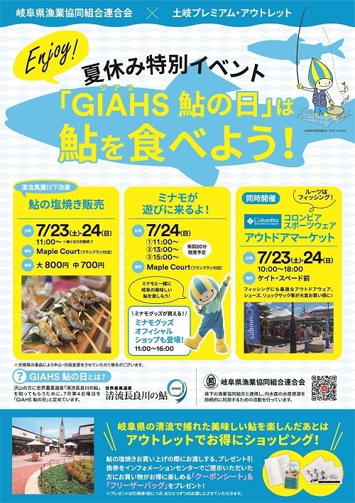 岐阜県漁業協同組合連合会(所在地:岐阜県岐阜市、以下「岐阜漁連」という)と、世界農業遺産「清流長良川の鮎」推進協議会(事務局:岐阜県)、土岐プレミアム・アウトレット(所在地:岐阜県土岐市 運営:三菱地所・サイモン株式会社)は、互いに連携し、2022年7月23日(土)、7月24日(日)の2日間、『「GIAHS鮎の日」は鮎を食べよう!』を初開催します。