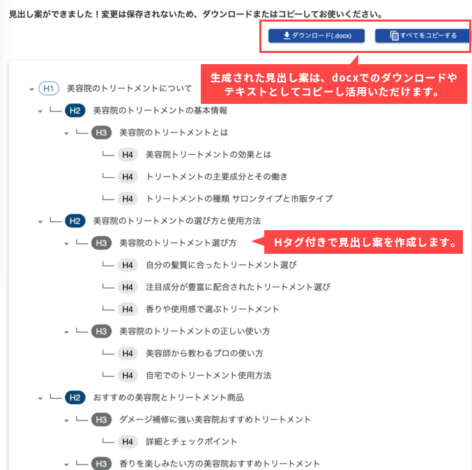 STEP③:生成された見出し案をドキュメントでダウンロード、またはテキストとしてコピーをして利用します。