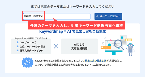 Keywordmapの強みである日本語キーワードの中から「ユーザーニーズ」「上位ページのタグ構成」「記事文章内のトピック」などの様々なジャンルのビッグデータを総合的に加味し、SEOの観点で実用性の高い見出し案を生成することができます。