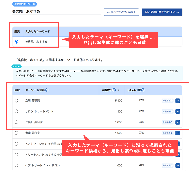 STEP②:入力したテーマに沿ったキーワードが提案されます。提案されたキーワード数が多い場合は、検索ボリューム・E-E-A-T度の数値等を参考に、キーワードを選定することができます。