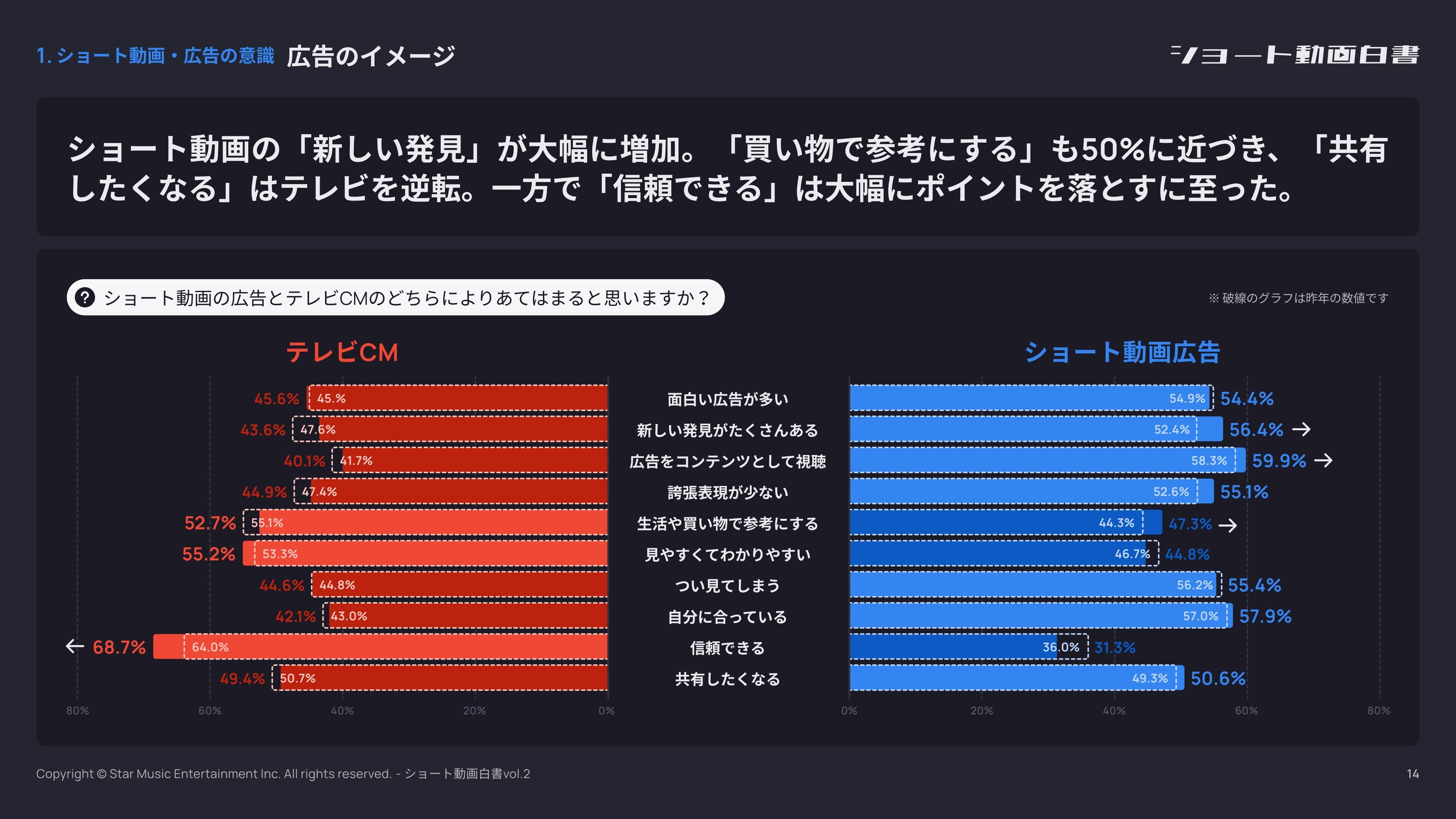 ショート動画の広告とテレビCMのイメージについては、ショート動画の広告には「新しい発見がたくさんある」という意見が56.4%(前年より4%増)と大幅に増加しています。