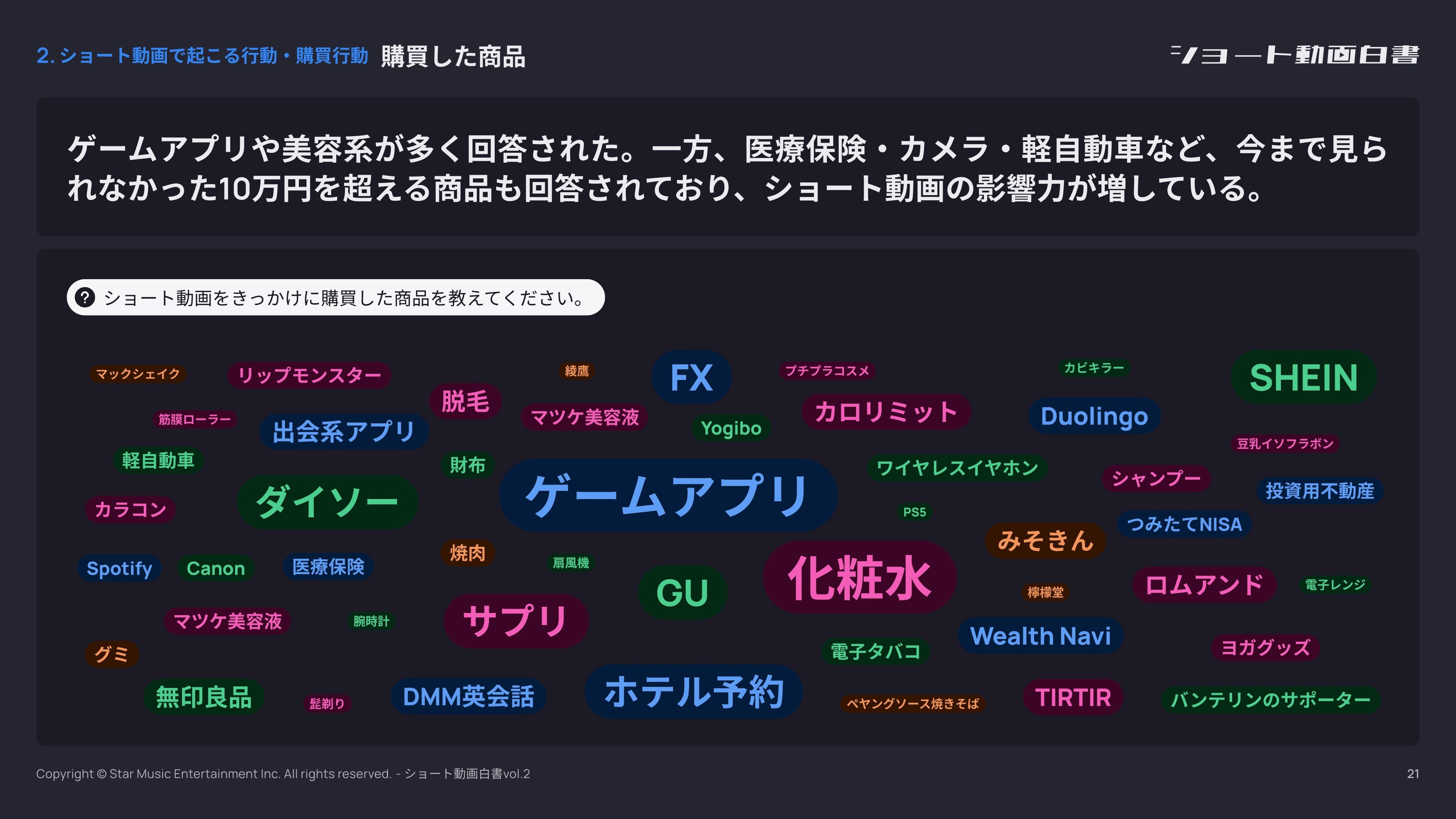 一方、医療保険・カメラ・軽自動車など、今まで見られなかった10万円を超える商品も回答されており、ショート動画の影響力が増していることがわかりました。