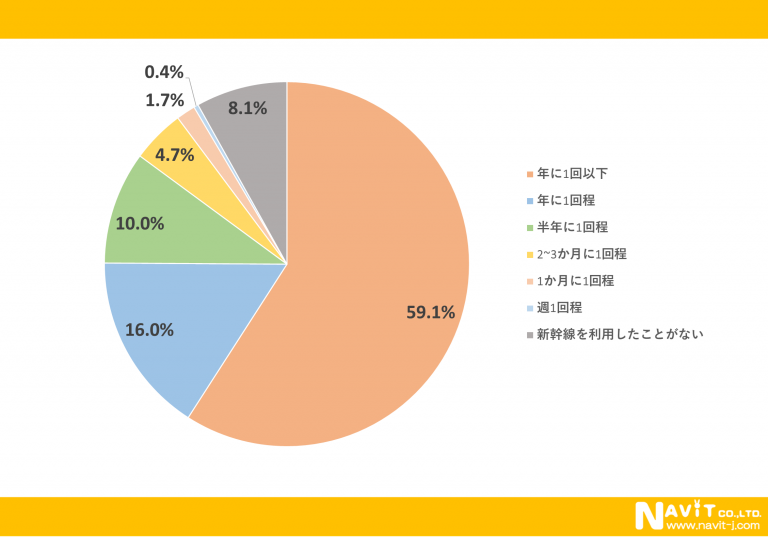 新幹線の利用頻度については、「年に1回以下」が59.1%、「年に1回程」が16.0%、「半年に1回程」が10.0%、「2~3か月に1回程」が4.7%という順になりました。