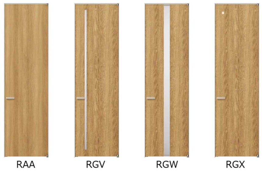 親子ドアは、11デザイン、子扉3デザインを組み合わせることができます。両開きドアは、親子ドアと同様の11デザインを展開。