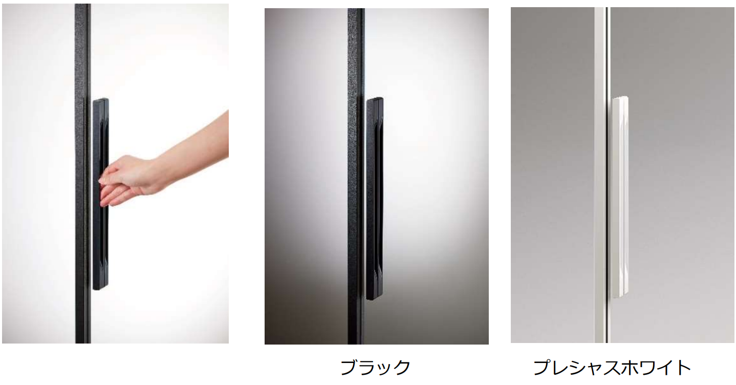 フレームに揃えたスリムなデザインで、手を掛ける部分は柔らかな曲線で指先に心地よさをもたらす形状です。ドアと引戸が並んで正面から見た時に同じデザインになるように引戸の引手もデザインを揃えています。