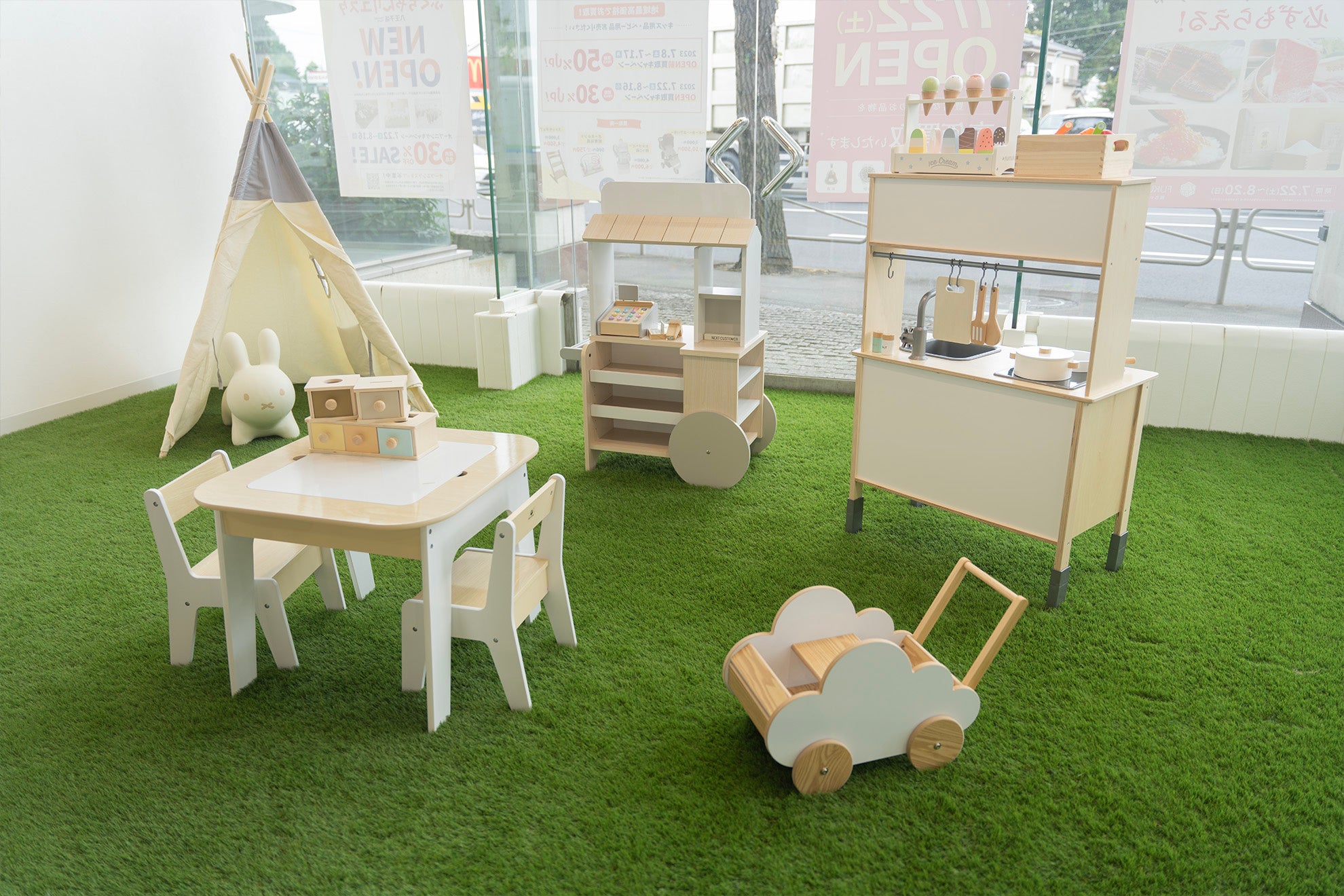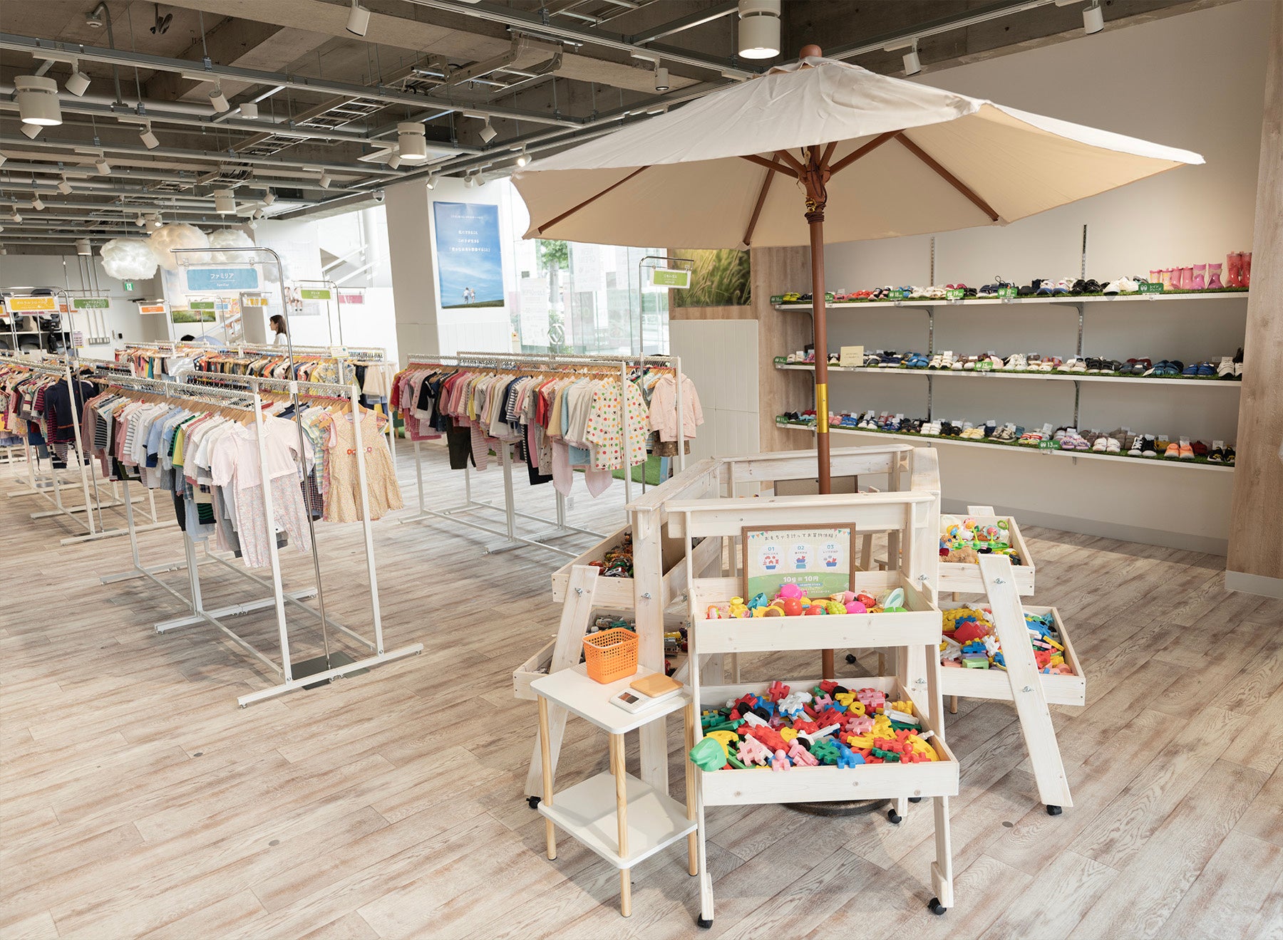 明るく天井が高い開放感のある空間や、キッズスペースを常設するなど従来のリユース店とは異なるキレイで居心地の良い店内にこだわっています。授乳室・おむつ替え台のあるベビーケアルームやお手洗いもベビーカーのまま入ることができ、通路も同様にベビーカーが通れる作りでお子様連れでも安心して利用できる店舗を心掛けています。また、こどもが自分で“お買い物”を体験できる “おもちゃの量り売り”ブースを設置。楽しみながら、モノやお金の大切さを学んでもらえます。