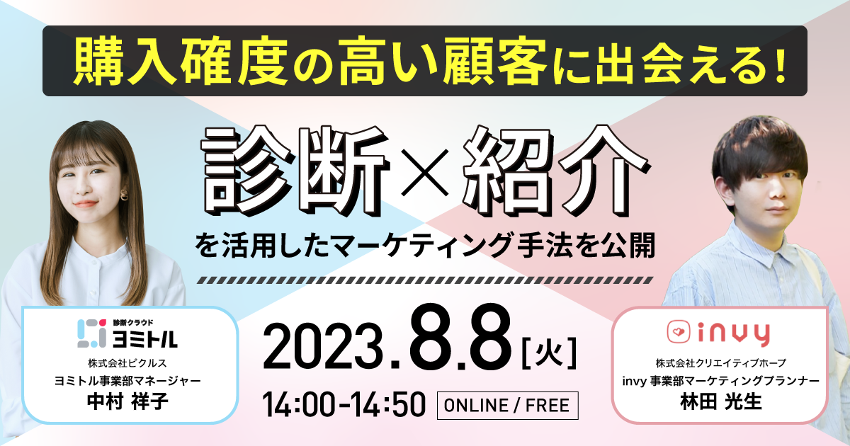 などのお悩みを抱えるマーケティング担当者は多いのではないでしょうか。 今の時代、膨大な情報が入ってくる顧客は簡単に「選択」ができなくなっており、購入前に離脱しています。 信用できる情報を各ユーザーに合せて伝えることで購入への「行動変容」を起こさせます。中でも、既存顧客など第三者からの「オススメ」は購入する重要な要素の1つです。 このセミナーでは、オススメからの購入率を劇的に向上させるためのマーケティング手法「診断×紹介」の戦略を紹介します。