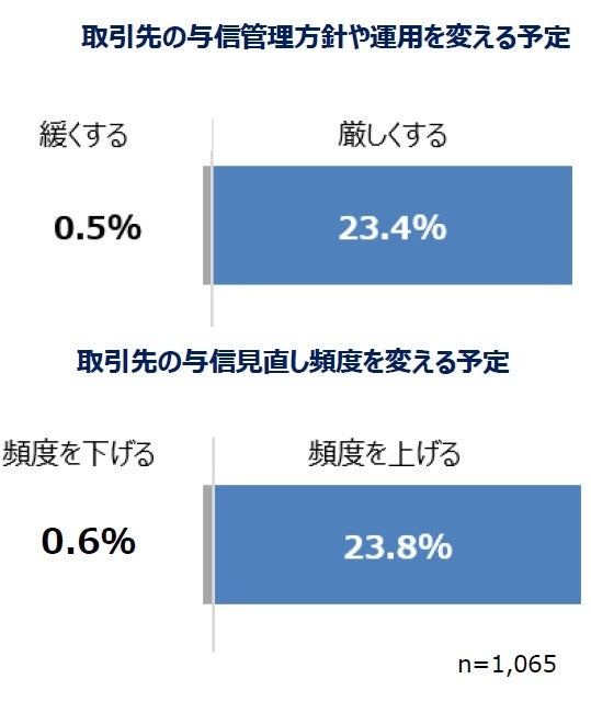 取引先に対する与信管理方針や運用を変える予定があるかについては「以前と変わらない」が76.2%と最も多くなったものの、23.4%の企業は与信管理を厳しくする方針(「与信を非常に厳しくする予定がある(非常に厳しくした)1.5%」+「与信を厳しくする予定がある(厳しくした)21.9%」)と回答した。