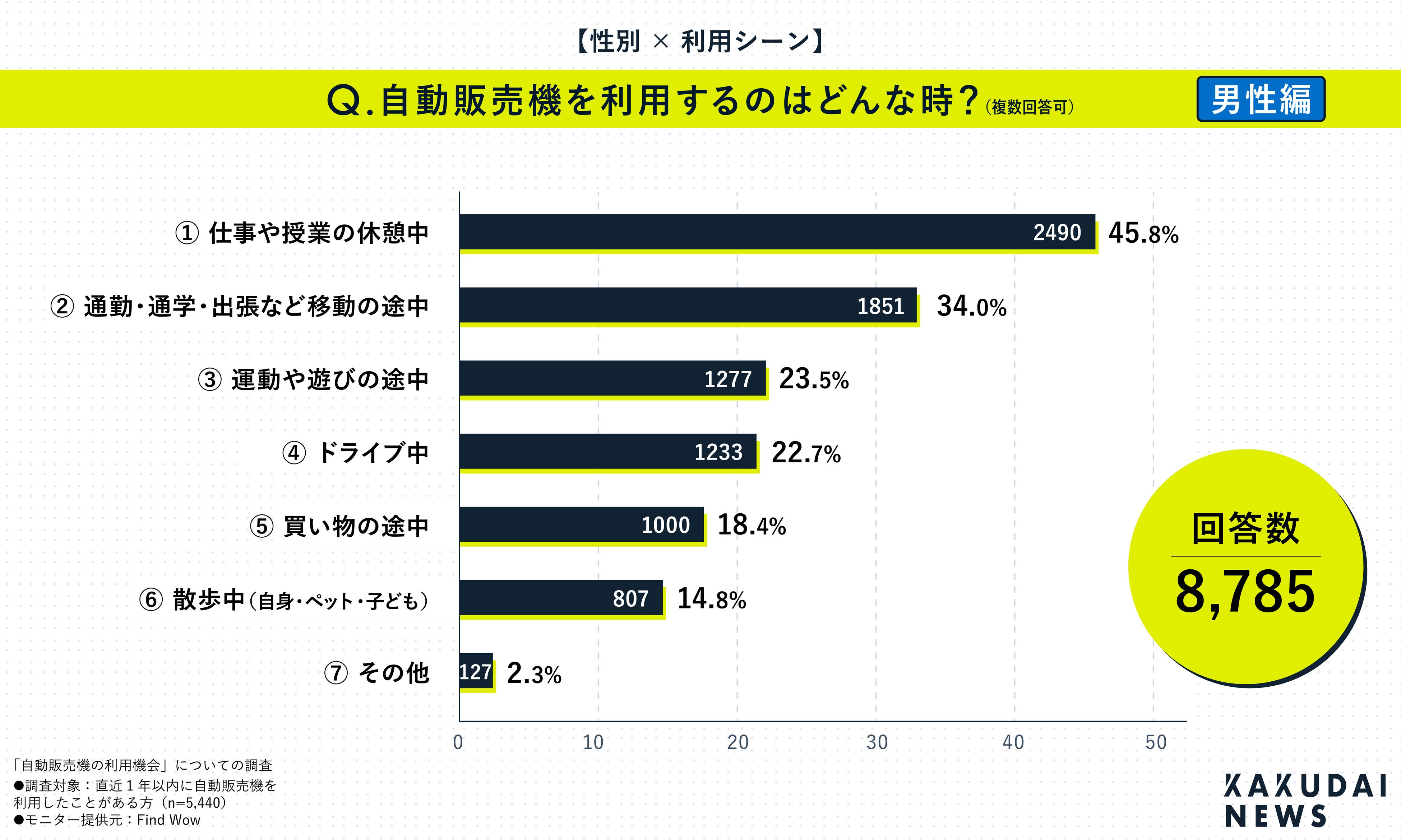 男性5,440名に「自動販売機を利用するのはどんな時?」と聞いたところ、『仕事や授業の休憩中(45.8%)』が最多でした。