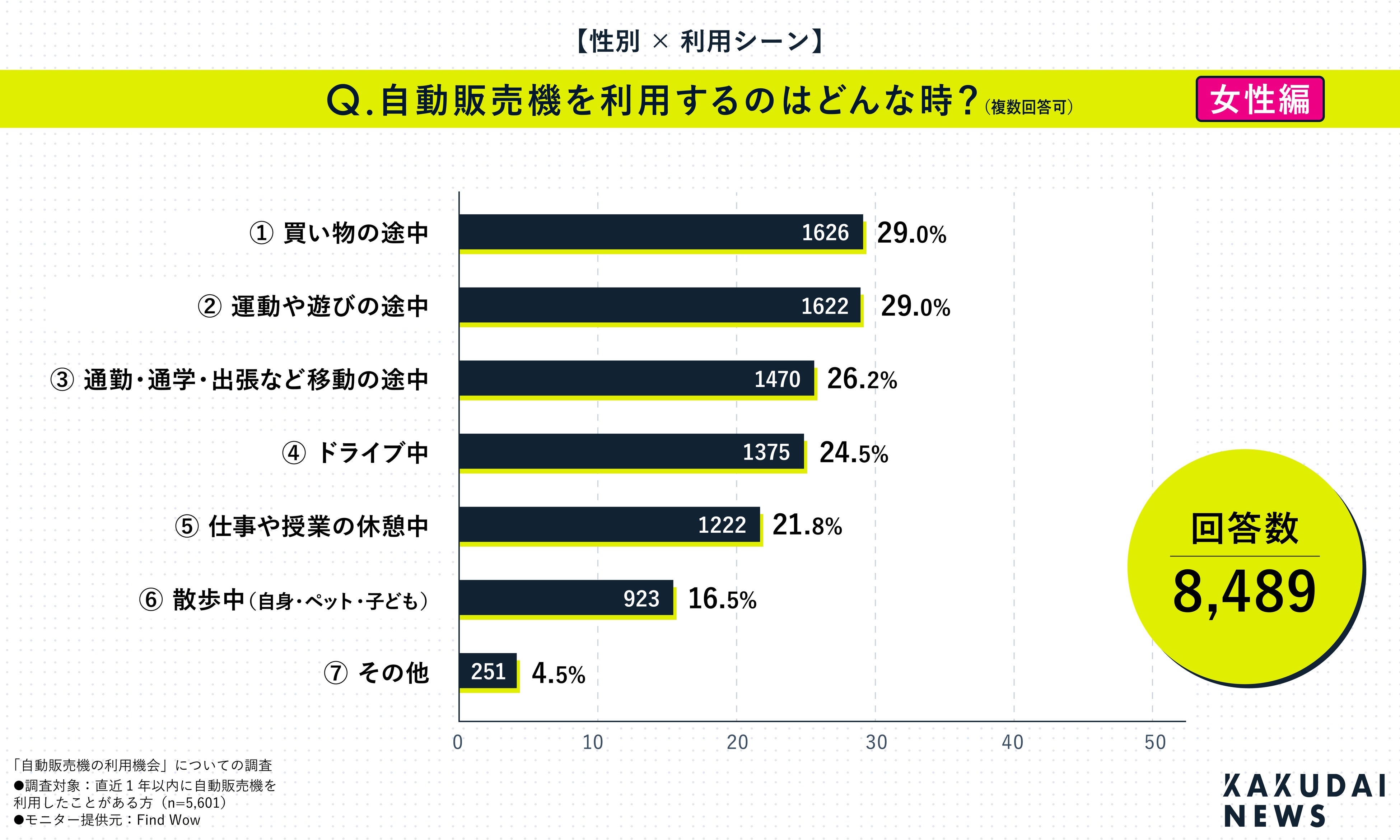 男女別では、自動販売機の利用シーンにかなりの乖離があることが判明しました。