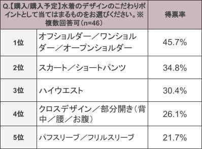 デザインのこだわりポイントは1位「オフショルダー/ワンショルダー/オープンショルダー」、4位「クロスデザイン/部分開き」といった洋服トレンド同様の「チラ肌見せ」となるデザインが人気だった。一方で、2位「スカート/ショートパンツ」、5位「パフスリーブ/フリルスリーブ」と袖やボトムスがある「洋服のようなデザイン」も人気を集めた。
