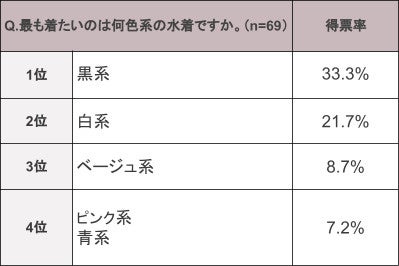 着用したい水着の色については、「黒系」が1位となり、コメントでも「黒」の水着に関するコメントが多く見られた。
