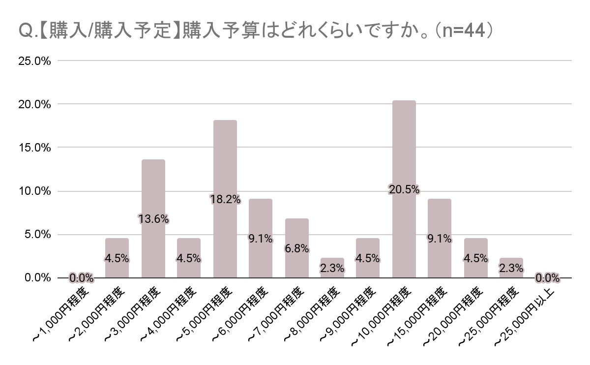 また、購入予算は「5,000円程度」と「1万円程度」の2つがボリュームゾーンとなり、どこで買うかのコメントでも「GRL」「Qoo10」「SHEIN」「ZOZOTOWN」といった通販サイトと、アパレルブランド名を挙げる2つのパターンに分かれた。