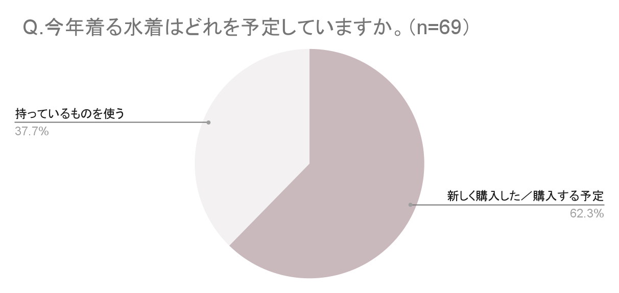 今回の調査でZ世代女性の水着事情についてアンケートを行ったところ、約7割が「今年、水着を着たい」と回答。さらにそのうち6割以上が「新しく購入した/購入する予定」と回答しており、今年購入した新たな水着で海水浴やプールへ行きたいZ世代が多くいることが伺えます。
