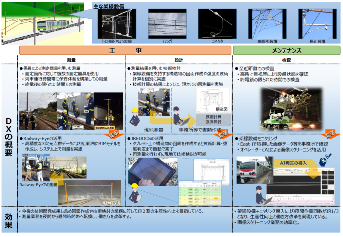 ○JR東日本では、架線設備※1の工事やメンテナンスにICTなどの先端技術を活用し、安全・安定輸送のさらなるレベルアップや将来の労働人口減少を見据えた業務のDXを推進しています。 ○架線設備の工事では、3Dレーザースキャナーや強度計算アプリを活用した測量や設計のDXを推進しています。 ○架線設備のメンテナンスでは、2021年10月より電気・軌道総合検測車(以下「East-i」)搭載のカメラおよびセンサーで取得した画像などのデータによる架線設備検査「架線設備モニタリング」の導入により、DXを推進しています。2023年度下期からは、取得した画像などのデータのAIによる画像スクリーニング※2を順次導入します。 |